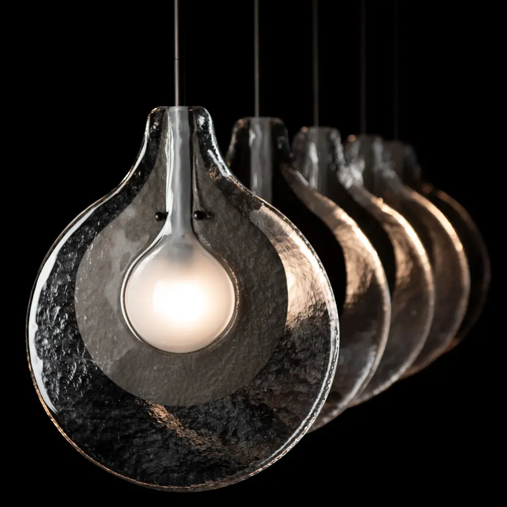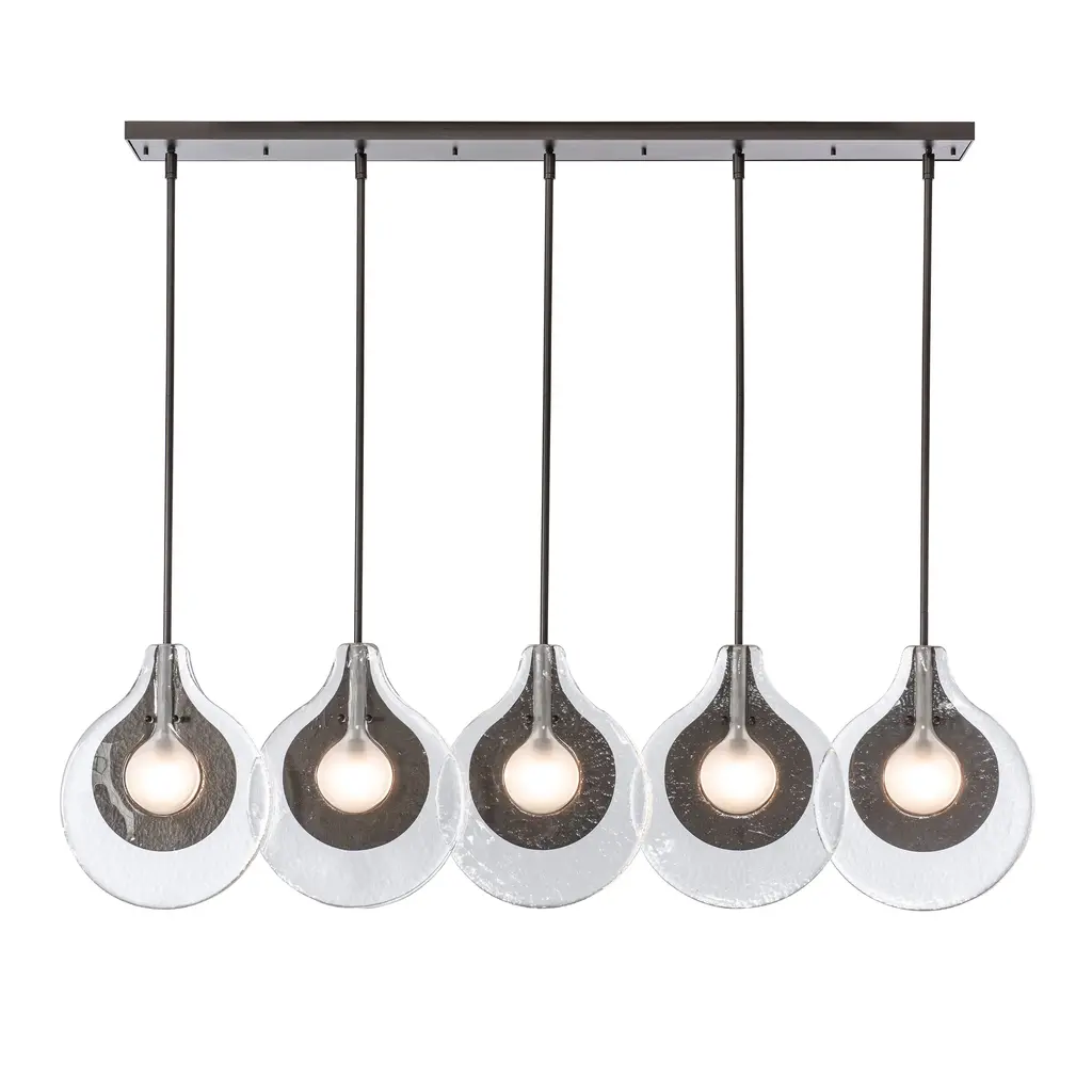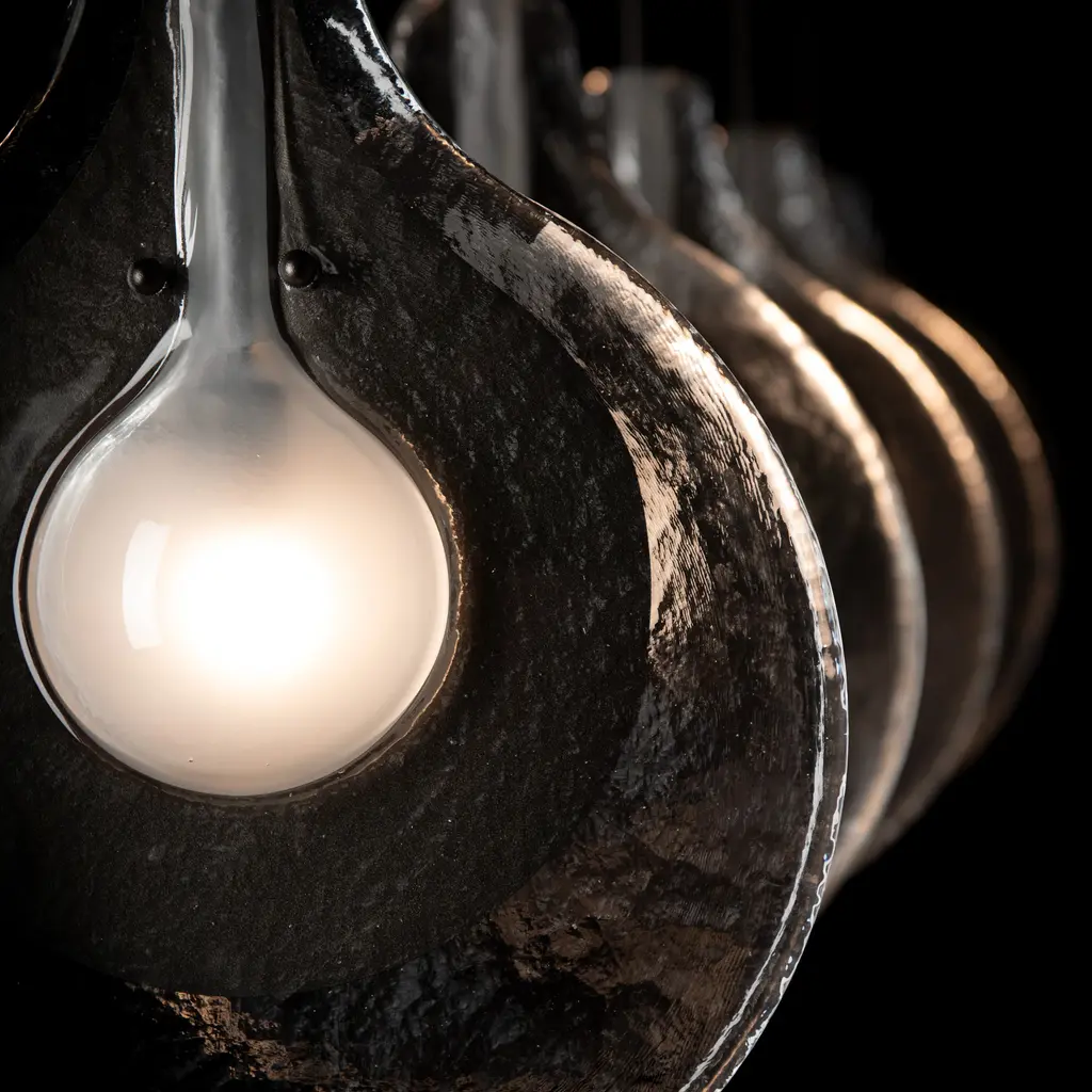 Elevate your space with the stunning, handcrafted Veneto Linear Pendant Light from Hubbardton Forge. The exquisite Venetian glass, textured to perfection, beautifully encases the metal and bulb elements. Designed by Jason Hancock, this pendant boasts five lights for a truly dramatic and surprising experience. Highlights