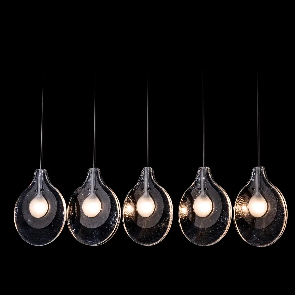 Elevate your space with the stunning, handcrafted Veneto Linear Pendant Light from Hubbardton Forge. The exquisite Venetian glass, textured to perfection, beautifully encases the metal and bulb elements. Designed by Jason Hancock, this pendant boasts five lights for a truly dramatic and surprising experience. Highlights