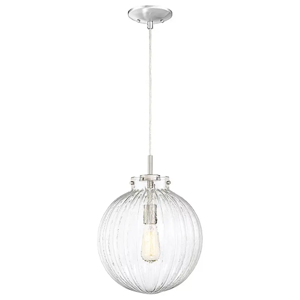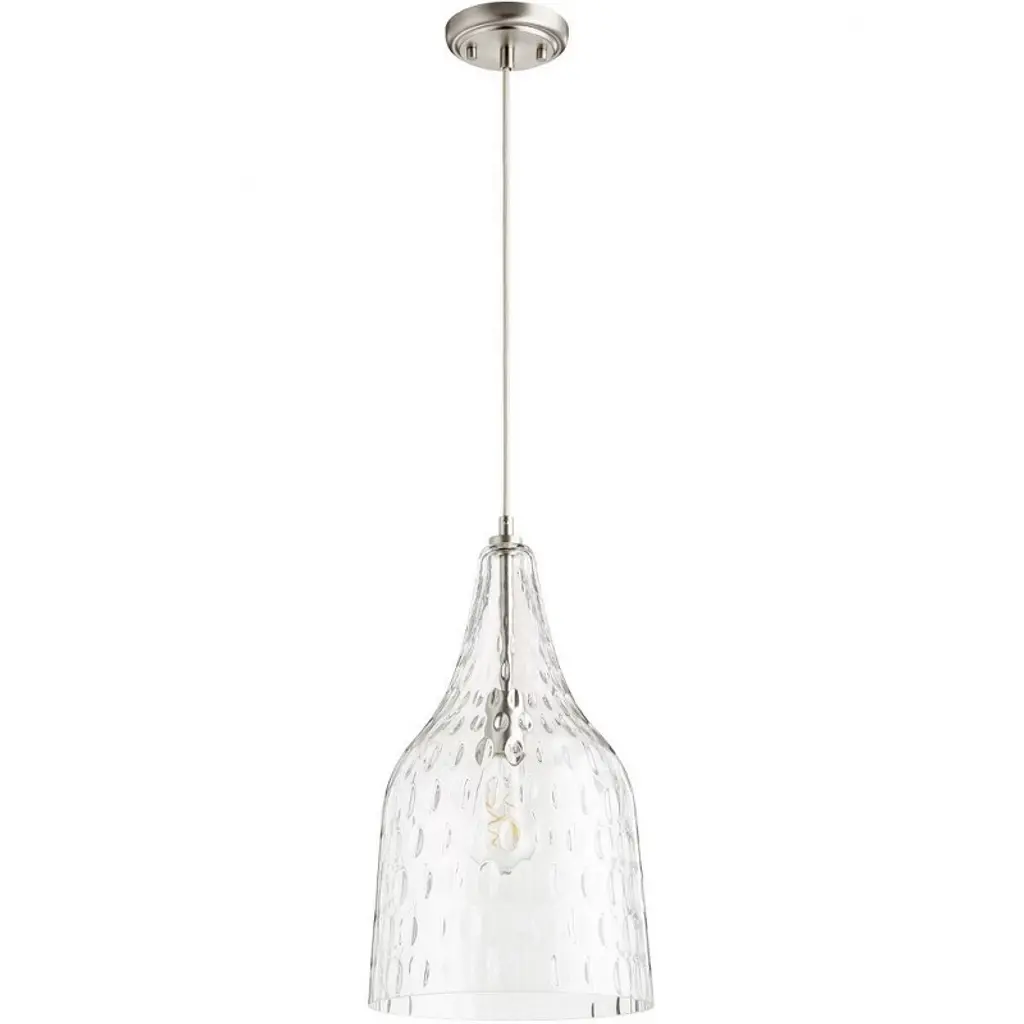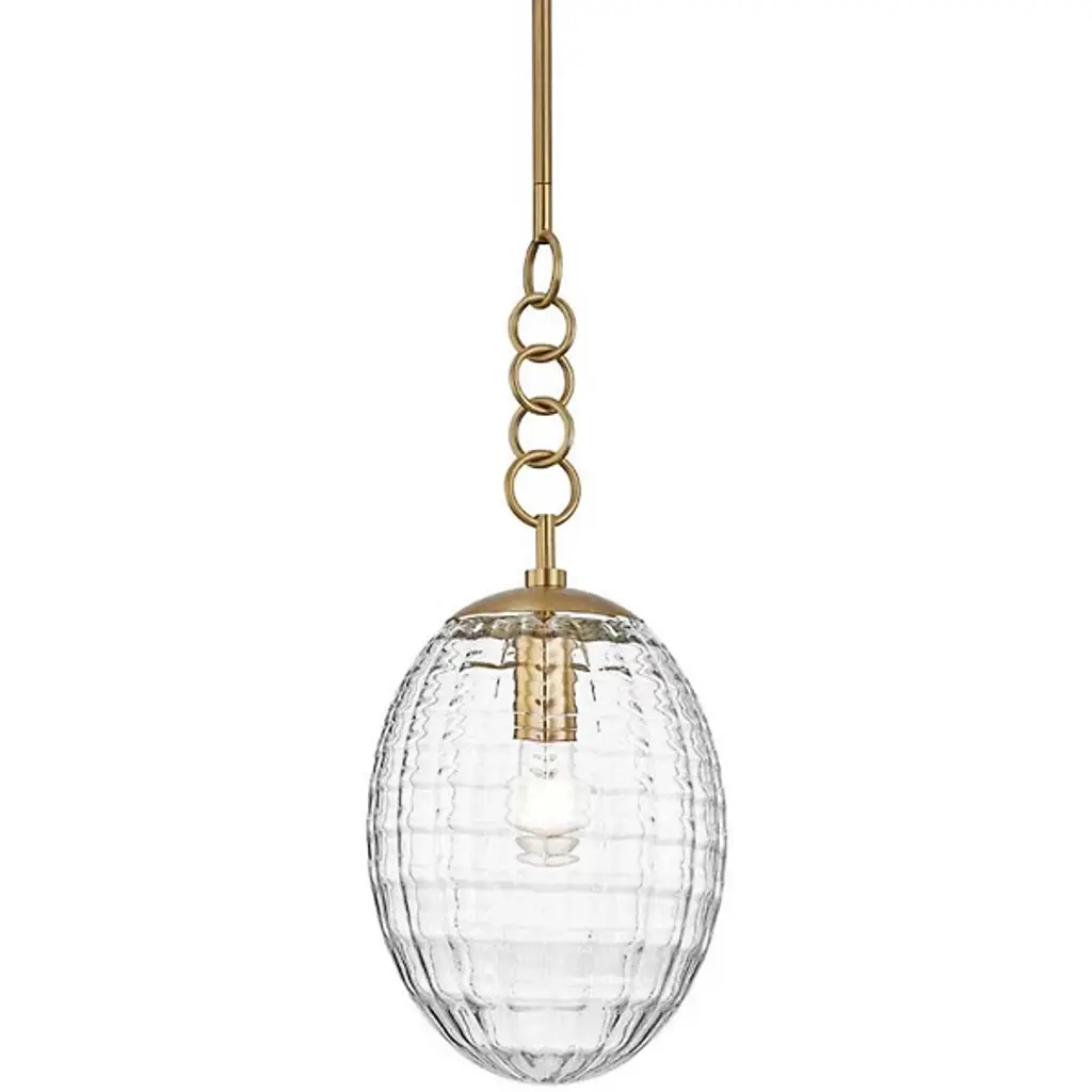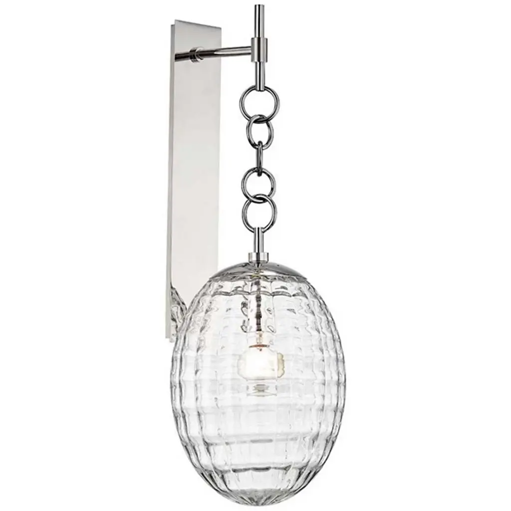 Contemporary design that radiates light to stunning effect. The Venice Pendant by Hudson Valley Lighting is crafted of Metal with a sleek, adjustable O-ring rod, a demilune canopy and 4 chain links that anchor to an oval-shaped shade made of Clear Optic Glass. The Glass features a dimpled exterior, displaying fractals of soft white light from an incandescent bulb. Install this piece above an entryway, accent chair, sofa or desk to create a beautifully refined source of light from above.