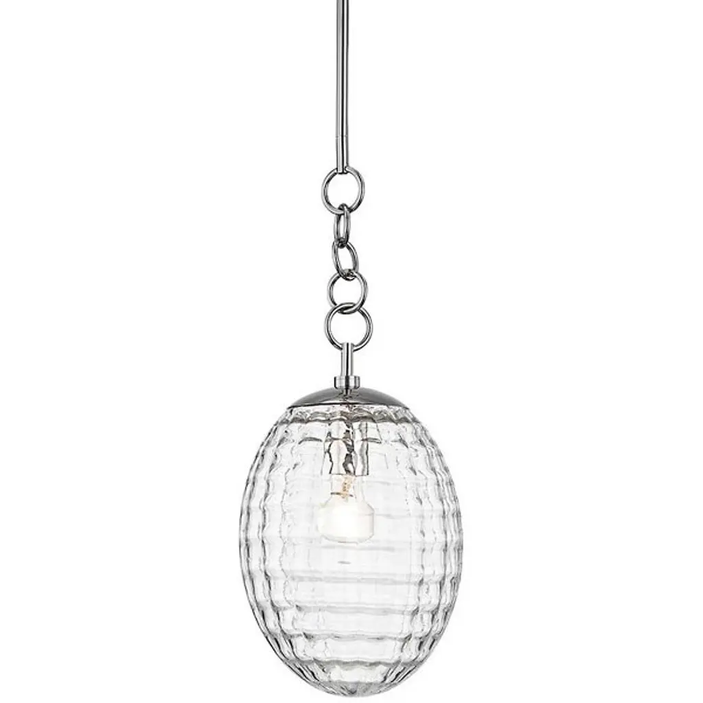 Contemporary design that radiates light to stunning effect. The Venice Pendant by Hudson Valley Lighting is crafted of Metal with a sleek, adjustable O-ring rod, a demilune canopy and 4 chain links that anchor to an oval-shaped shade made of Clear Optic Glass. The Glass features a dimpled exterior, displaying fractals of soft white light from an incandescent bulb. Install this piece above an entryway, accent chair, sofa or desk to create a beautifully refined source of light from above.