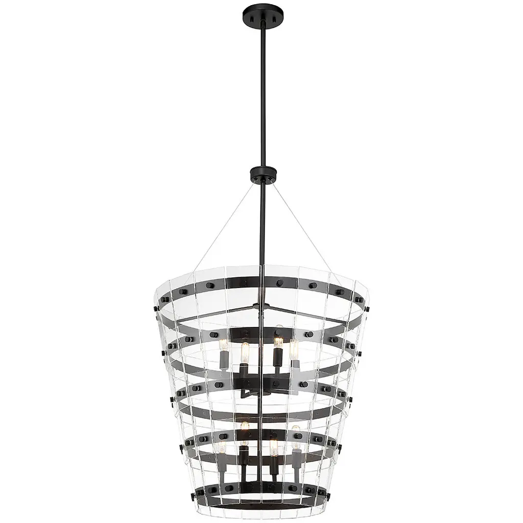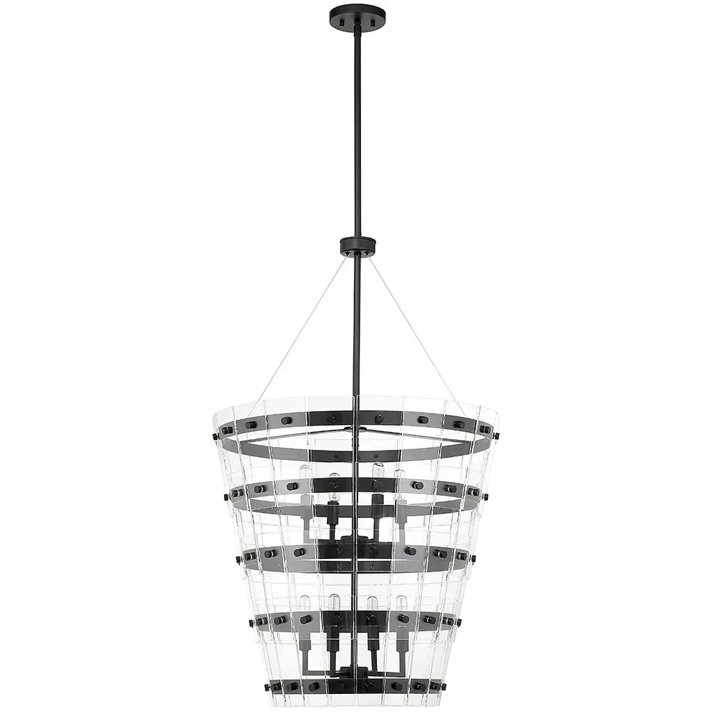 This Savoy House Ventari 8-light pendant is beautifully elegant in its simplicity. Its structure is adorned with slats of clear glass, finished in matte black and appears to be suspended in midair. Ventari is 25" in width and has an adjustable height ranging from 41.5" to 95". Comes with four 12" downrods and one 6" downrod. It uses 8 candelabra size bulbs of up to 60 watts per bulb (bulbs not included).