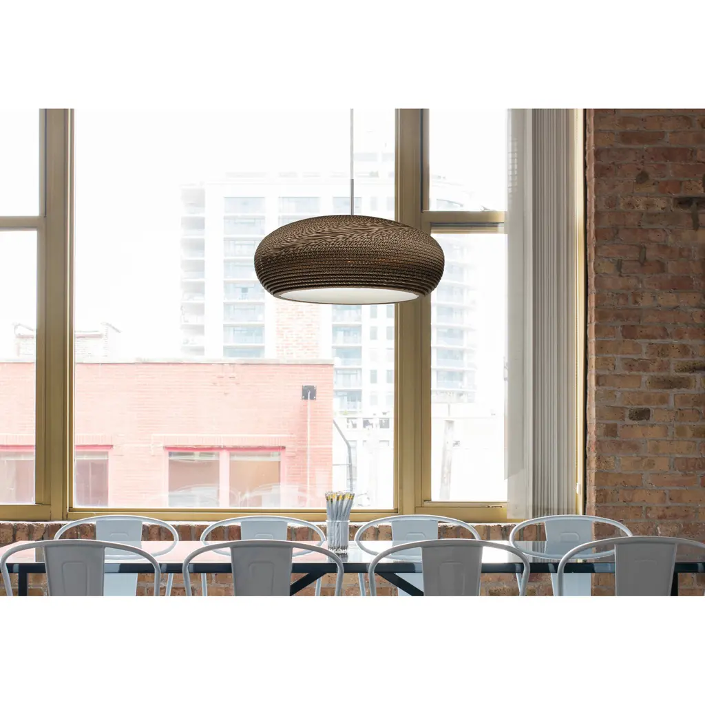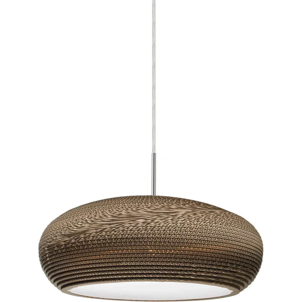 The urban stylings of our Venus LED pendant are ideal for todays modern architecture, composed of intricately cut layers of tan corrugated cardboard. Each layer is precisely sized and positioned to exude a gritty spin to a visually appealing shape.This broadly radiused shade includes a white acrylic bottom shield to conceal lamping. The cord pendant fixture is equipped with a 10' SVT cordset and a low profile flat monopoint canopy. These stylish and functional luminaries are offered in a beautiful Black finish.
