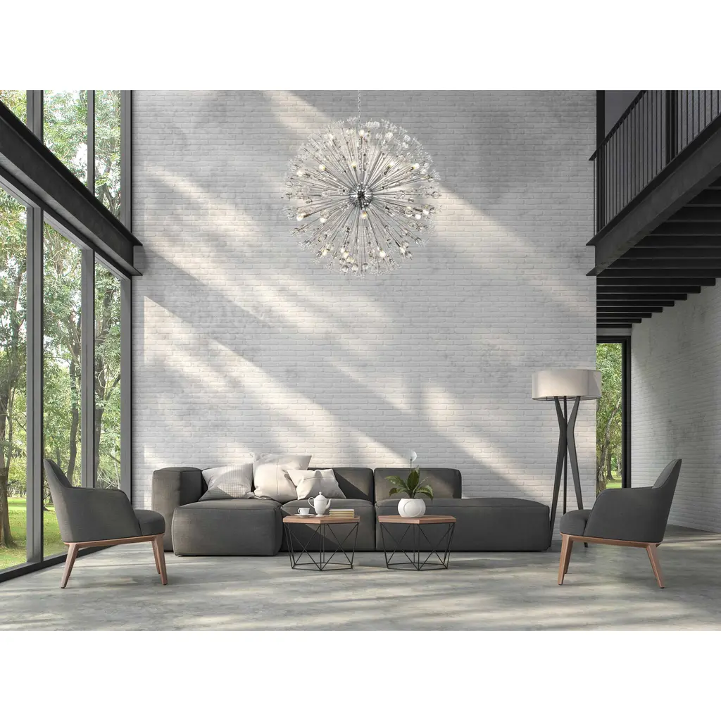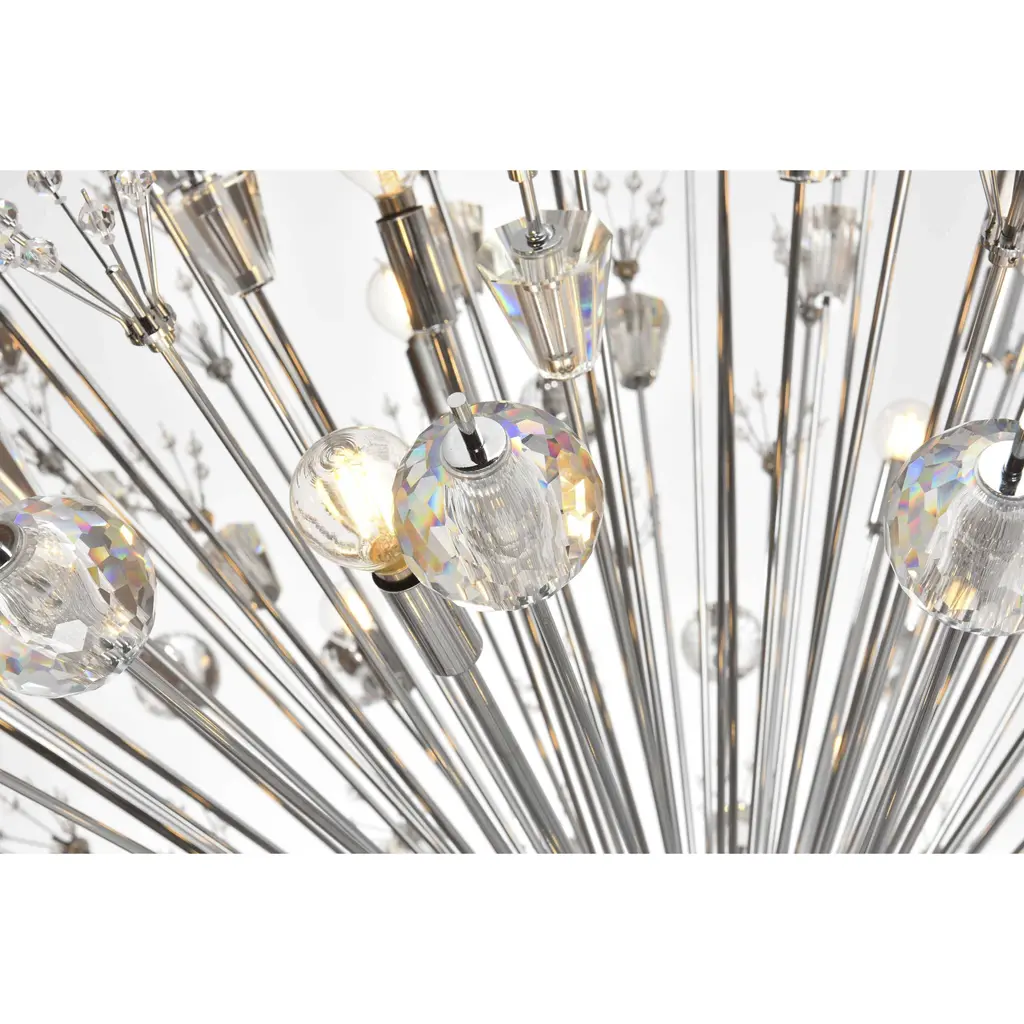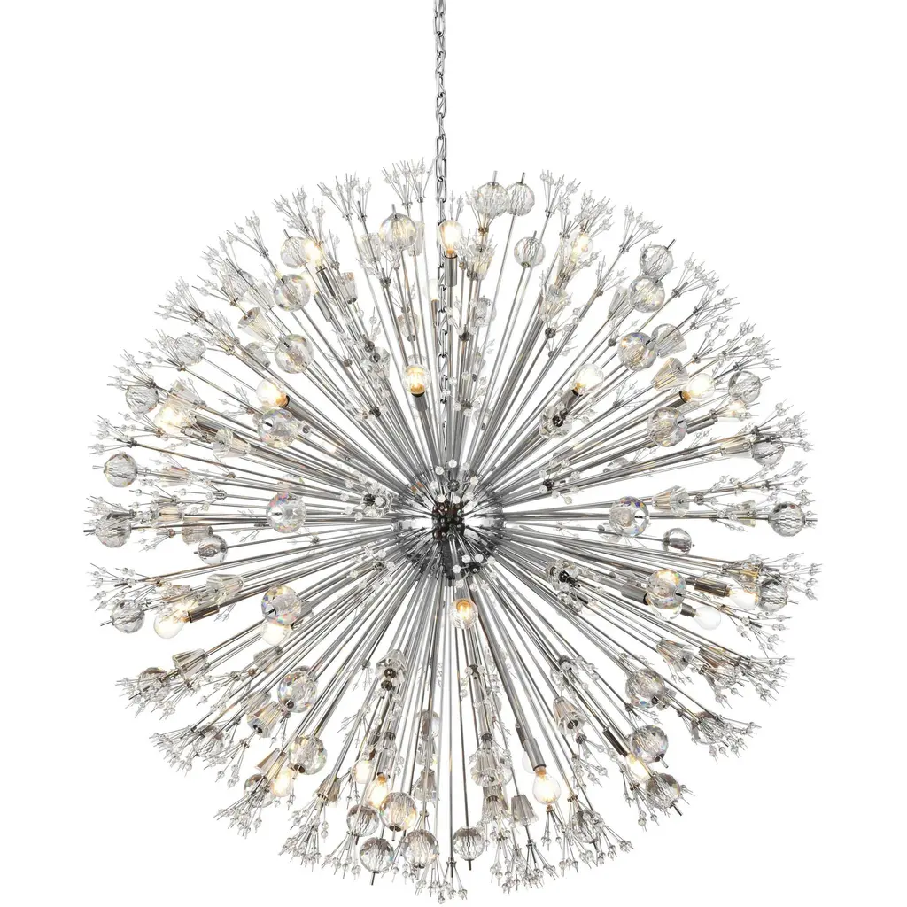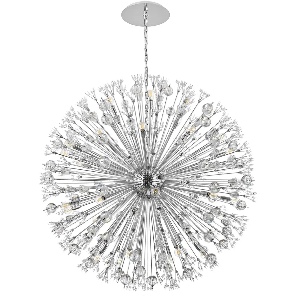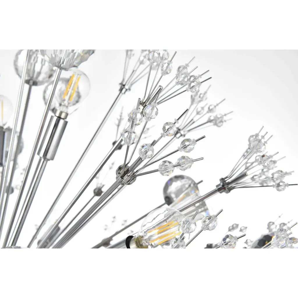 Like an explosion frozen in time, Vera collection hanging fixtures are suspended chaos. Clear large crystal balls and sprays of smaller crystals swirl amidst exposed candelabra bulbs (not included) balanced on dainty wires. A gleaming steel sphere forms the epicenter of the storm. A touch of savage beauty that easily compliments a kitchen, entryway, or bedroom. With easy assembly and compatibility with multiple bulbs, this chandelier not only illuminates but elevates your space with timeless sophistication.