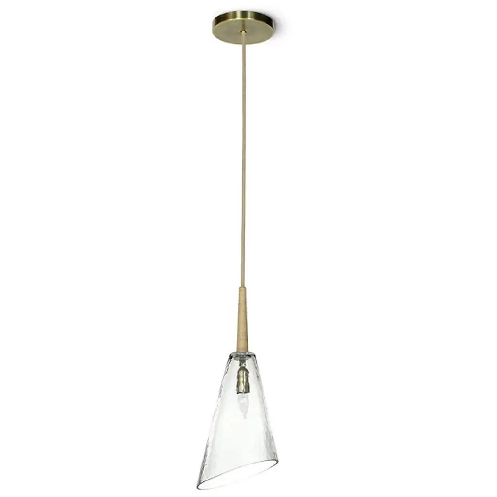 The Veraldi Mini Pendant from Palecek delights with a decadent but not delicate appeal as it broadcasts a mix of ambient warmth and downlight. Secured by a circular canopy, a slim cord descends to a jute-wrapped conical accent, supporting a single downward-facing lamping placed inside a conical shade of translucent glass featuring a bevel-cut end for a touch of abstract accent.