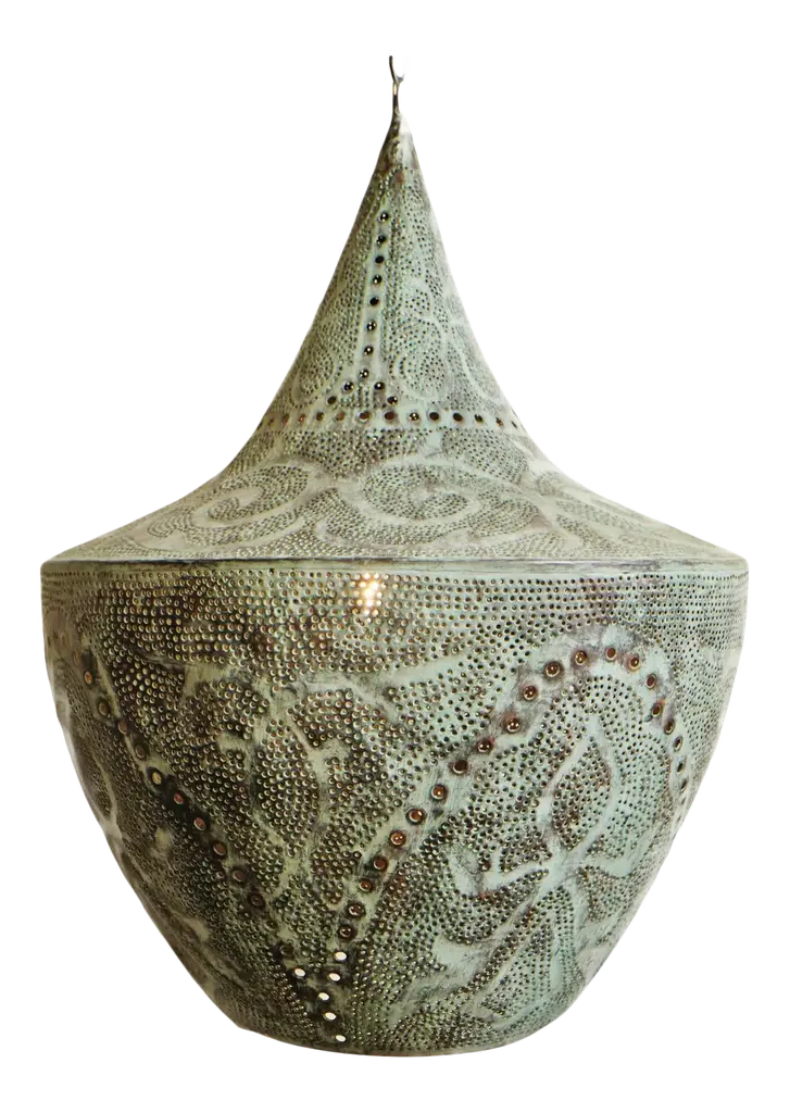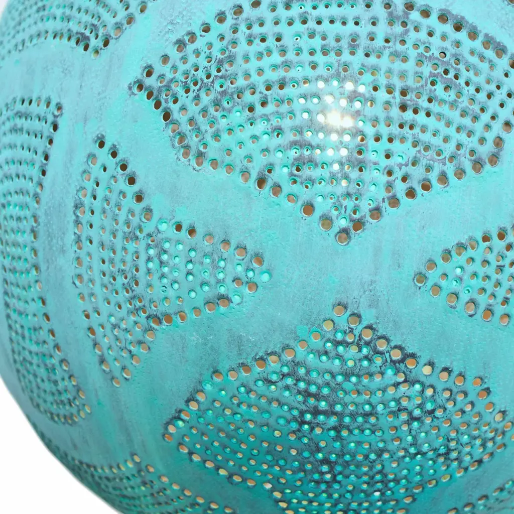 Beautiful verdigris turquoise copper globe lantern with hand perforated moorish design patterns. Added ambience with light displays through hand crafted design. Each lantern may vary in exact coloring/patina, hand crafted detail, and distress. Includes 3’ hanging chain and black ceiling plate. 100 watt max fixture. Bulb not included.