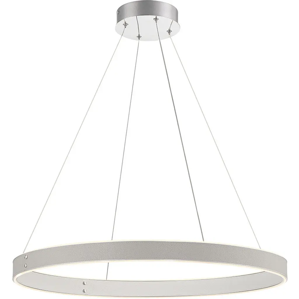 The Verdura collection features vegan leather, accentuated by decorative silver studs. The two-toned fabric highlights one color on the inside while displaying a complementary second color on the outer ring. The textured grooves are highlighted by the luminous glow of integrated LED lights that are encased between. This collection is not only abundant in size but also in the number of fixtures offered. Be it a small home office or a grand staircase, the Verdura collection is available in a range of fixture sizes to fit any room space.