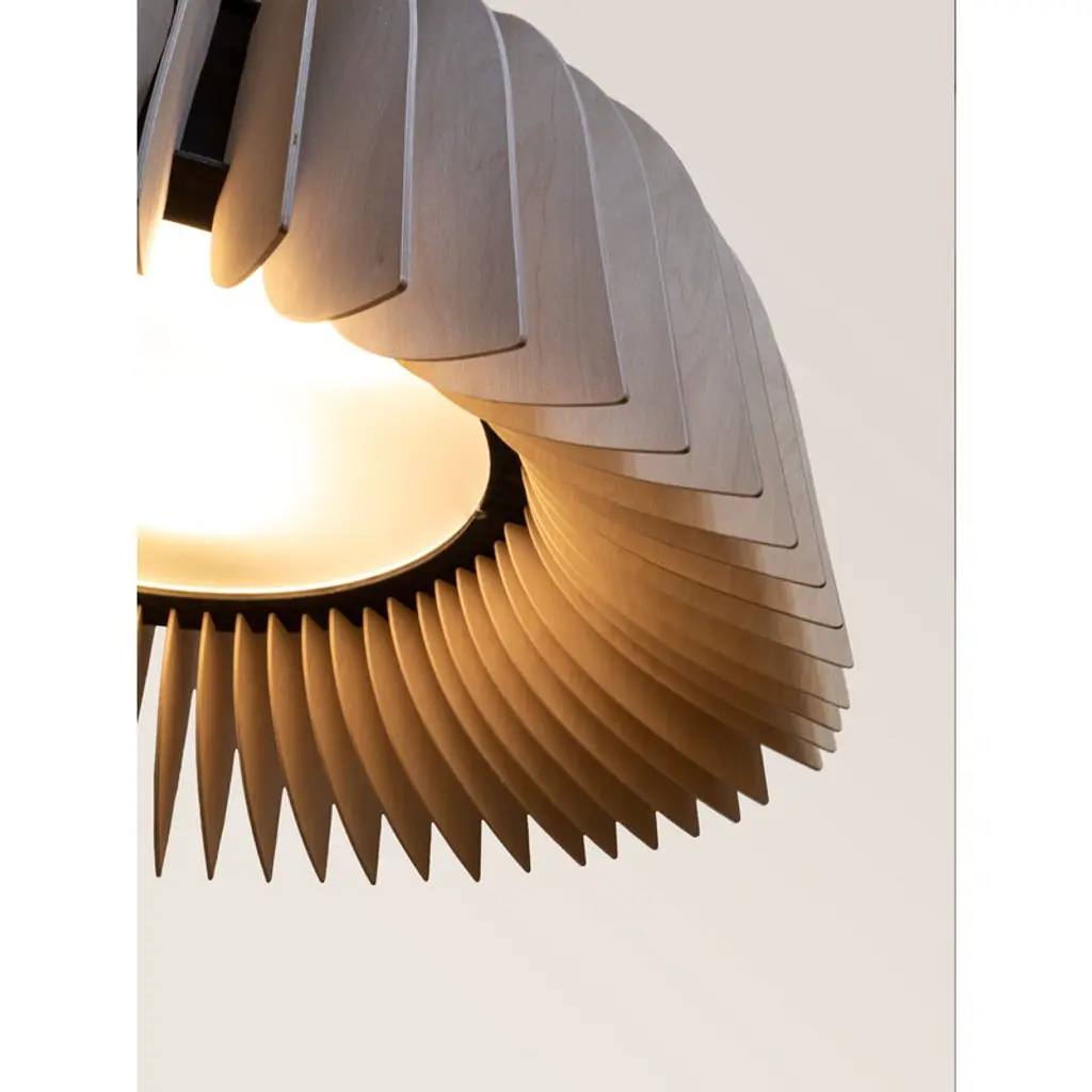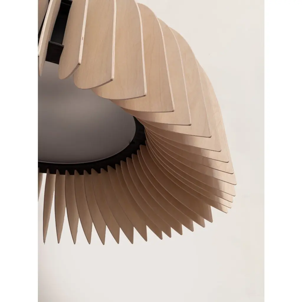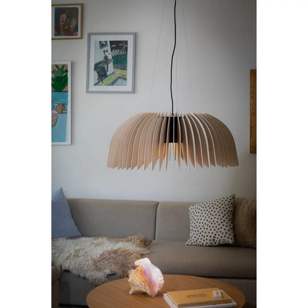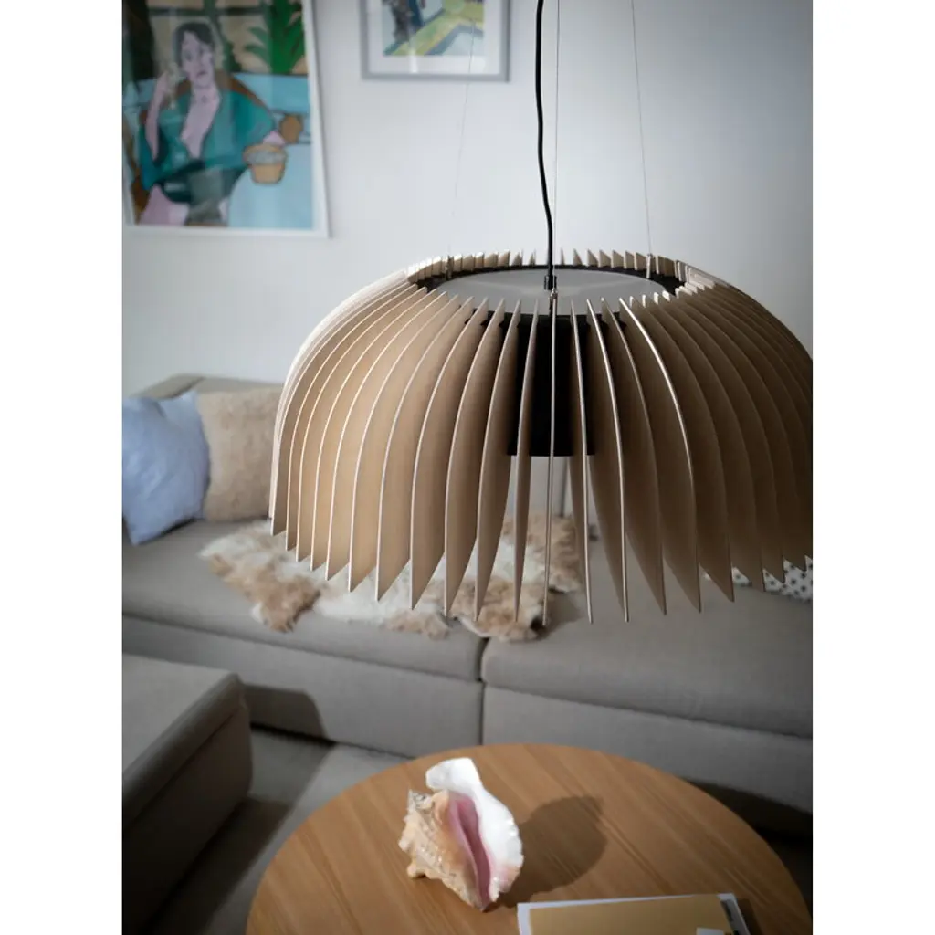 Pilke Lights' Verna pendant light captivates with its airy wooden shade, composed of thin, wing-shaped pieces of birch plywood. The structure gains depth from the black wooden rings to which the water-cut plywood pieces have been attached by hand. Casting beautiful downward light, the large Verna 77 pendant lamp is ideal for illuminating a larger dining area or a coffee table, for instance. This version features an integrated, glare-free LED light source that is also dimmable. Designer Simo Serpola drew inspiration for the Verna collection from the Northern spring, with the collection's name referring to the color of spring green. Made in Finland from certified Finnish birch, the luminaires bring a touch of Nordic forests and a springtime feel to any interior throughout the year. The Verna lights are equally charming whether suspended individually or grouped in multiples, and you can also mix and match different sizes to create a unique arrangement.