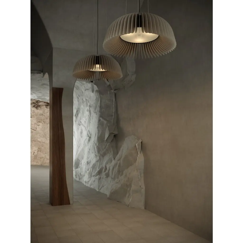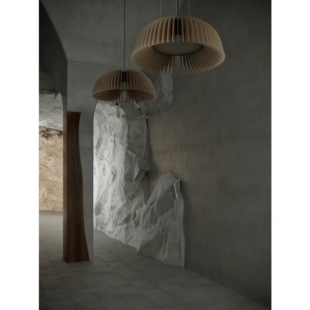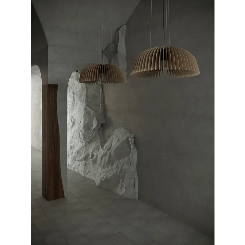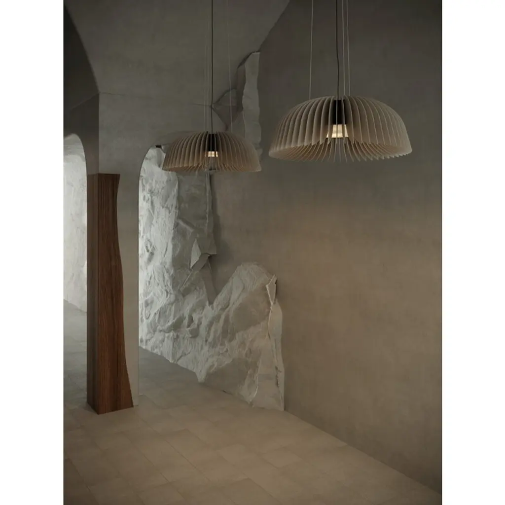 Pilke Lights' Verna pendant light captivates with its airy wooden shade, composed of thin, wing-shaped pieces of birch plywood. The structure gains depth from the black wooden rings to which the water-cut plywood pieces have been attached by hand. Casting beautiful downward light, the large Verna 77 pendant lamp is ideal for illuminating a larger dining area or a coffee table, for instance. This version features an integrated, glare-free LED light source that is also dimmable. Designer Simo Serpola drew inspiration for the Verna collection from the Northern spring, with the collection's name referring to the color of spring green. Made in Finland from certified Finnish birch, the luminaires bring a touch of Nordic forests and a springtime feel to any interior throughout the year. The Verna lights are equally charming whether suspended individually or grouped in multiples, and you can also mix and match different sizes to create a unique arrangement.