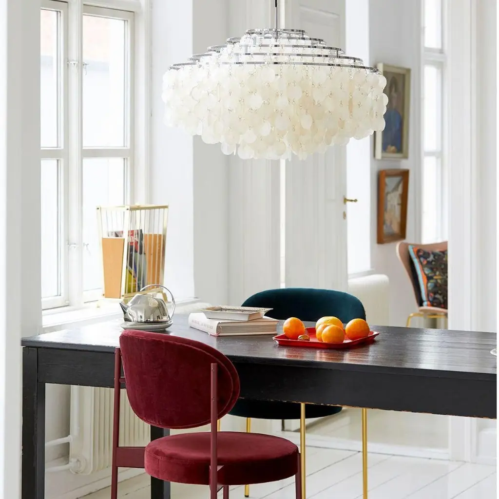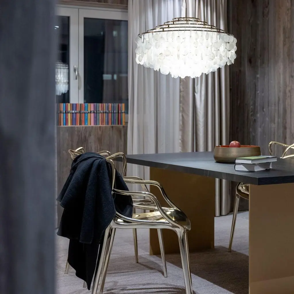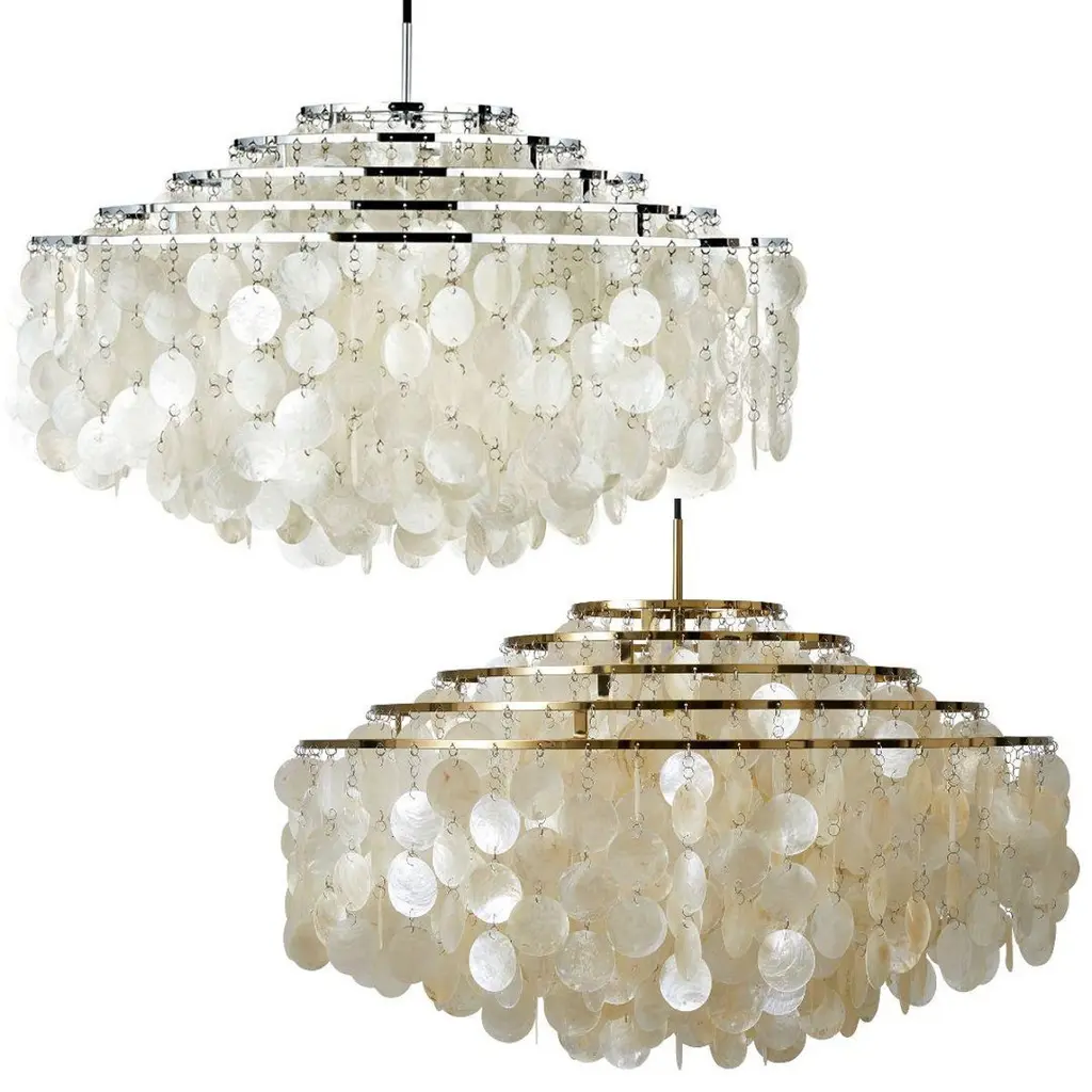 Verner Panton 'Fun 11DM' pendant lamp in sea shells and brass for Verpan.Verner Panton was one of Denmark's most legendary modern furniture and interior designers. His innovative experimentation with new materials, bold shapes and vibrant colors shines through in his most iconic pieces, faithfully and sustainably re-editioned by Verpan since 2003. First designed in 1964, the 'Fun 11DM' has long been considered Panton's greatest masterpiece in lighting design. Featuring 5 floating metal rings from which an array of circular sea shells are artfully suspended from, the 'Fun 11DM' highlights the unmistakable brilliance of Panton. Created to be equally appealing alone or displayed in clusters, and whether illuminated in a brilliant warm glow or powered off with the shells organic properties on display. The 'Fun 11DM' is executed in a brass plated structure, sea shells and stainless steel rings to the exacting standards of Verpan using the finest materials available.Price per item. Available in unlimited quantities in either chrome or brass and in 2 sizes. Also available in table, floor, wall and chandelier variants, please see our other listings.In stock lead time 2-4 weeks. Out of stock can add an additional 8 weeks or more. Please note that lead times, cost and inventory availability are subject to change without notice. Please contact us for current lead times prior to placing time-sensitive orders.Accommodates single standard medium base E26 bulb (bulb not included). Max 60 watt, lower with incandescent. Suspended from brass plated metal canopy by black fabric cord with a maximum drop of 13'. This lamp is UL listed.Made to order. All sales are final.