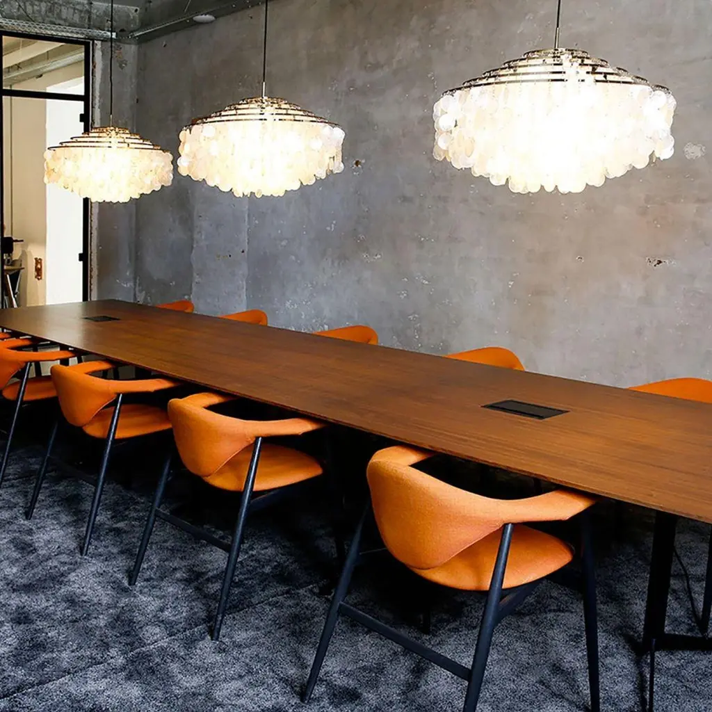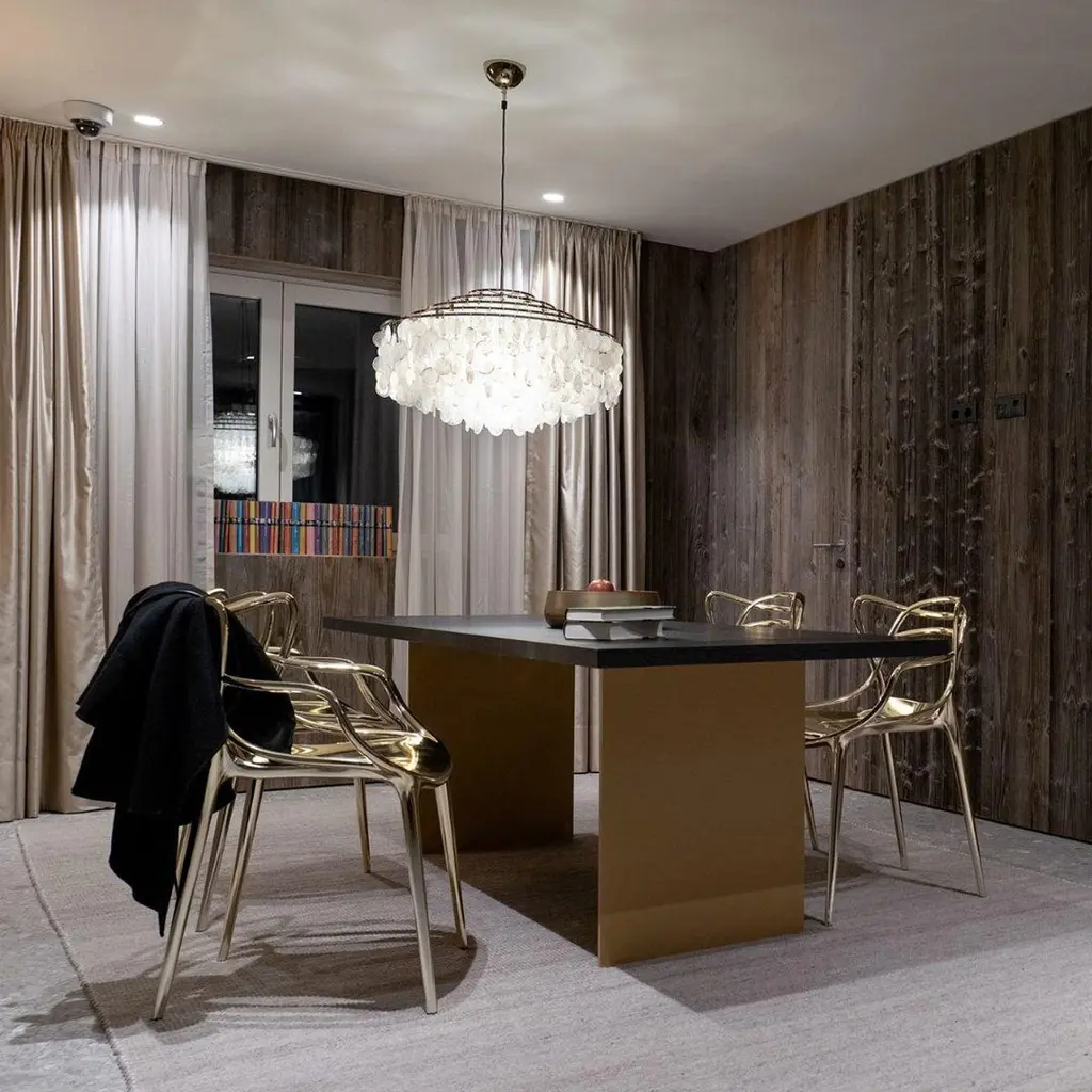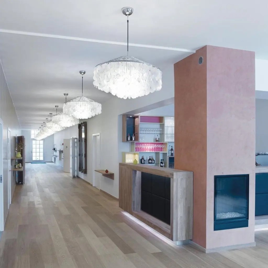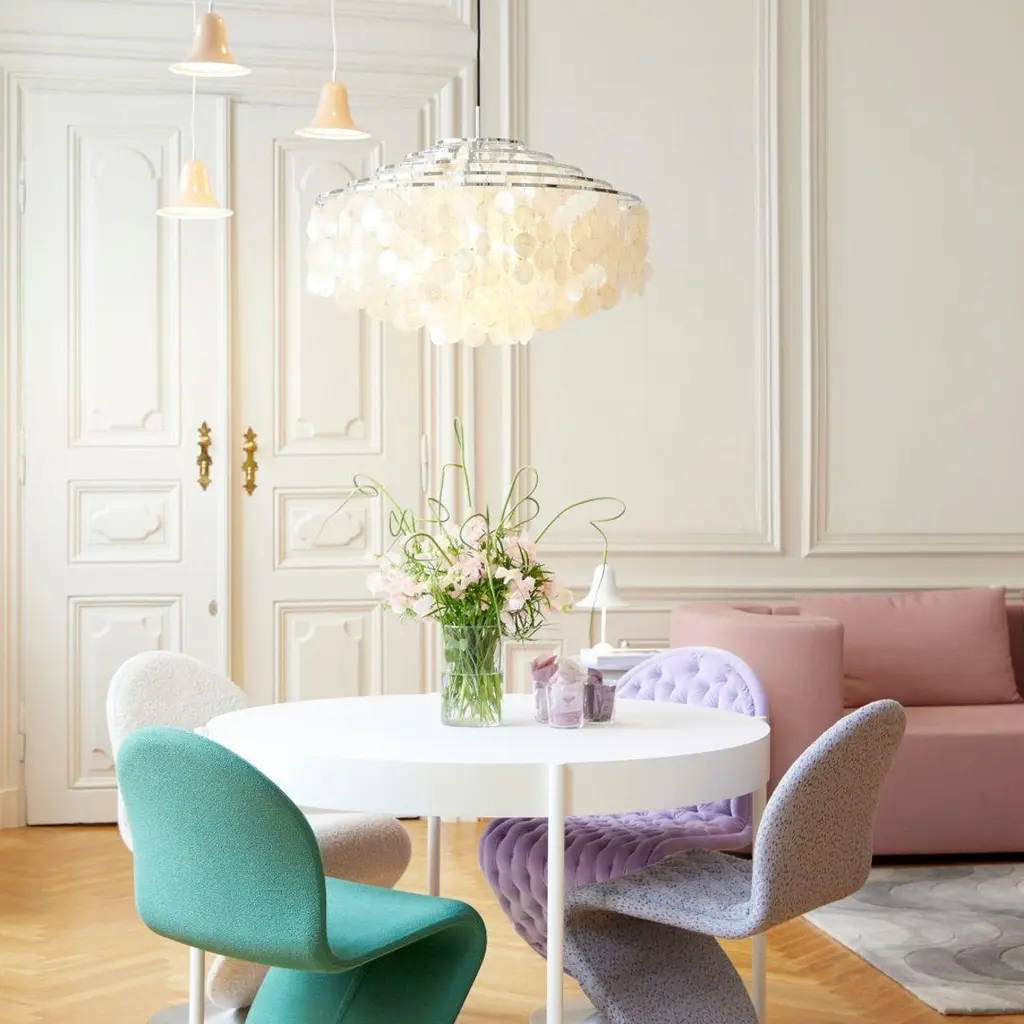 Verner Panton 'Fun 11DM' pendant lamp in sea shells and brass for Verpan.Verner Panton was one of Denmark's most legendary modern furniture and interior designers. His innovative experimentation with new materials, bold shapes and vibrant colors shines through in his most iconic pieces, faithfully and sustainably re-editioned by Verpan since 2003. First designed in 1964, the 'Fun 11DM' has long been considered Panton's greatest masterpiece in lighting design. Featuring 5 floating metal rings from which an array of circular sea shells are artfully suspended from, the 'Fun 11DM' highlights the unmistakable brilliance of Panton. Created to be equally appealing alone or displayed in clusters, and whether illuminated in a brilliant warm glow or powered off with the shells organic properties on display. The 'Fun 11DM' is executed in a brass plated structure, sea shells and stainless steel rings to the exacting standards of Verpan using the finest materials available.Price per item. Available in unlimited quantities in either chrome or brass and in 2 sizes. Also available in table, floor, wall and chandelier variants, please see our other listings.In stock lead time 2-4 weeks. Out of stock can add an additional 8 weeks or more. Please note that lead times, cost and inventory availability are subject to change without notice. Please contact us for current lead times prior to placing time-sensitive orders.Accommodates single standard medium base E26 bulb (bulb not included). Max 60 watt, lower with incandescent. Suspended from brass plated metal canopy by black fabric cord with a maximum drop of 13'. This lamp is UL listed.Made to order. All sales are final.