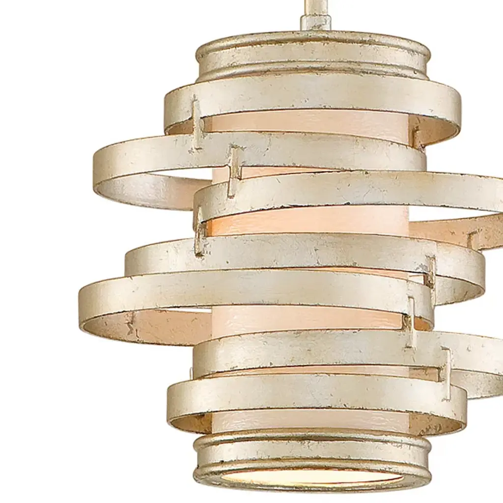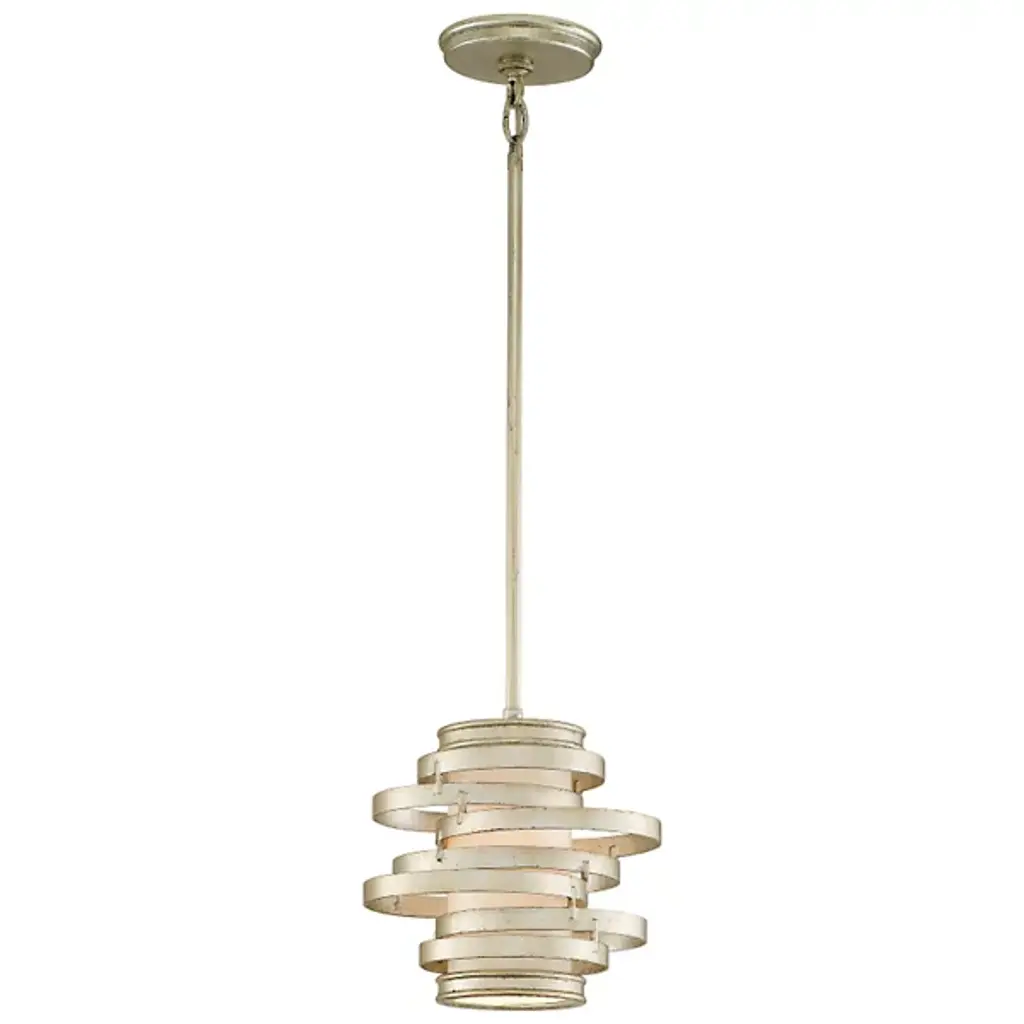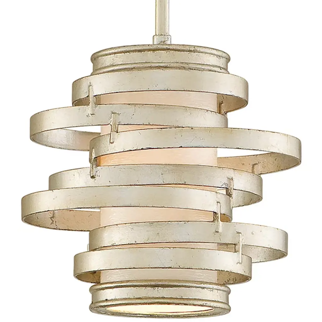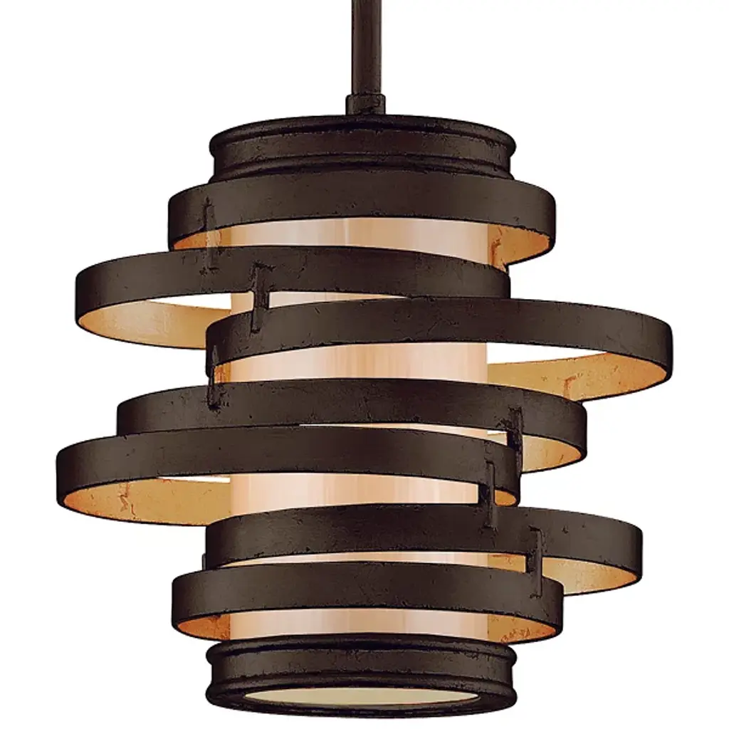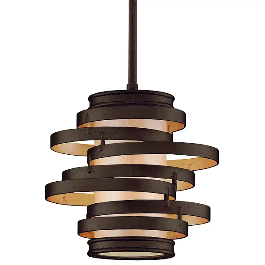 The Corbett Lighting Vertigo Mini Pendant features concentric circles of hand forged iron around a frosted glass shade. The effect is dynamic, and gives the impression of movement just as the name implies. The illumination is softly diffused through the glass cylinder, lighting the space with energy as well as illumination with a contemporary spin.
