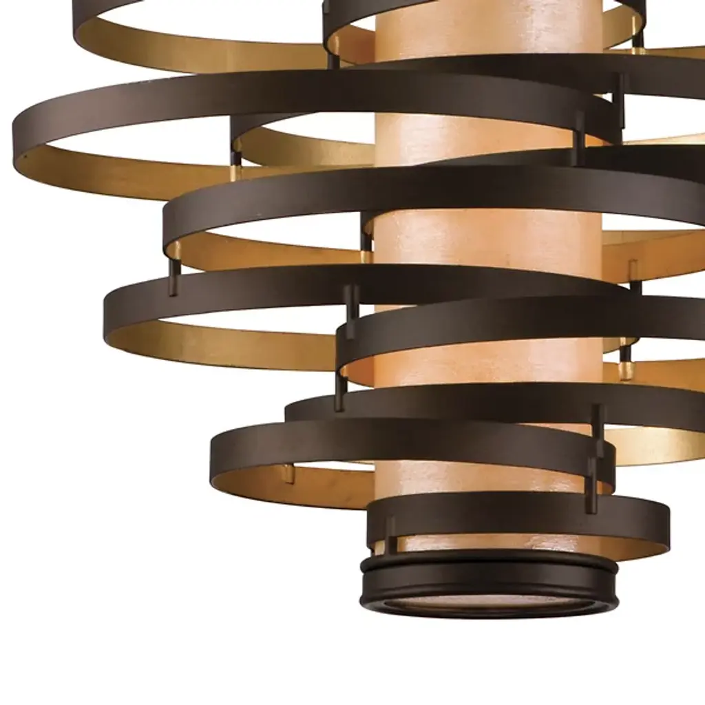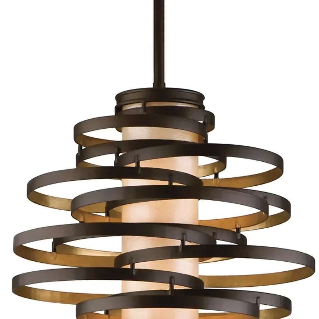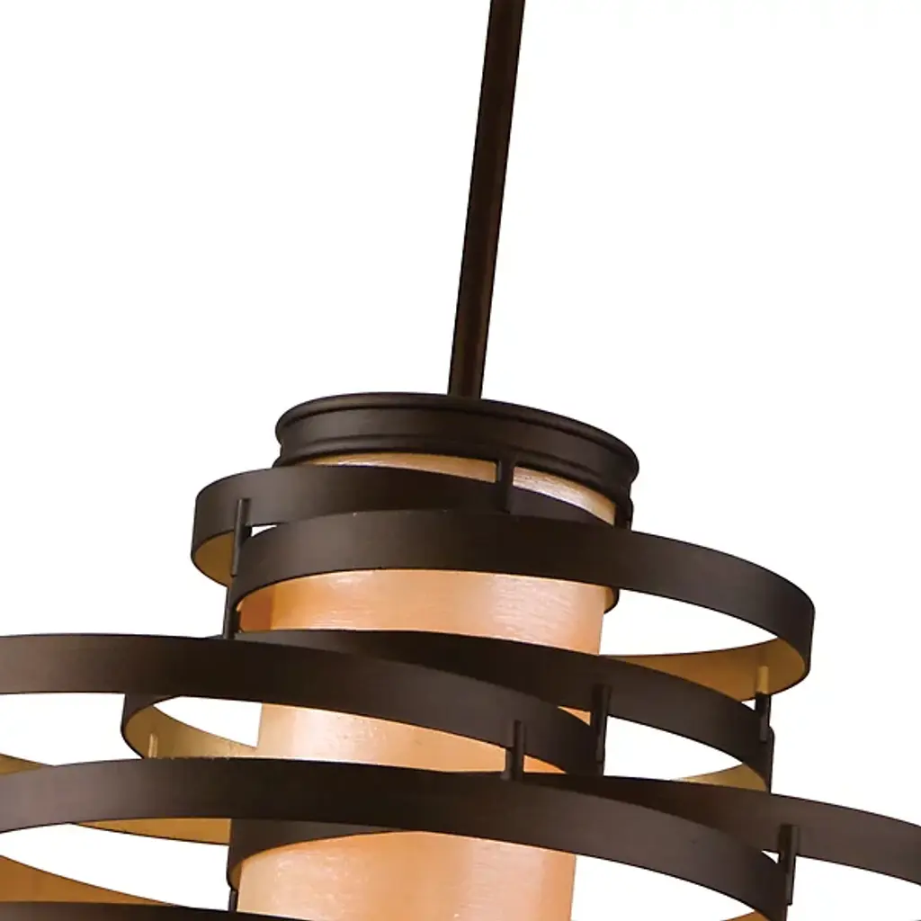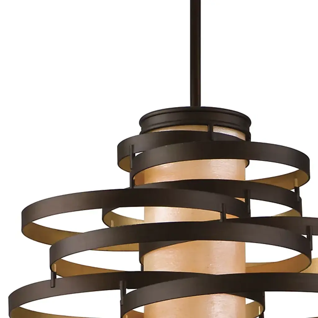 The Corbett Lighting Vertigo Pendant features twisted pieces of metal spiraled around in an uncontrolled fashion, but have no fear each piece is firmly adhered together. Made with a hand crafted iron body and fiber glass shade, this pendant will light your space in a dynamic fashion just as the name implies.