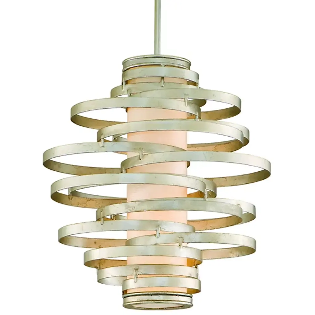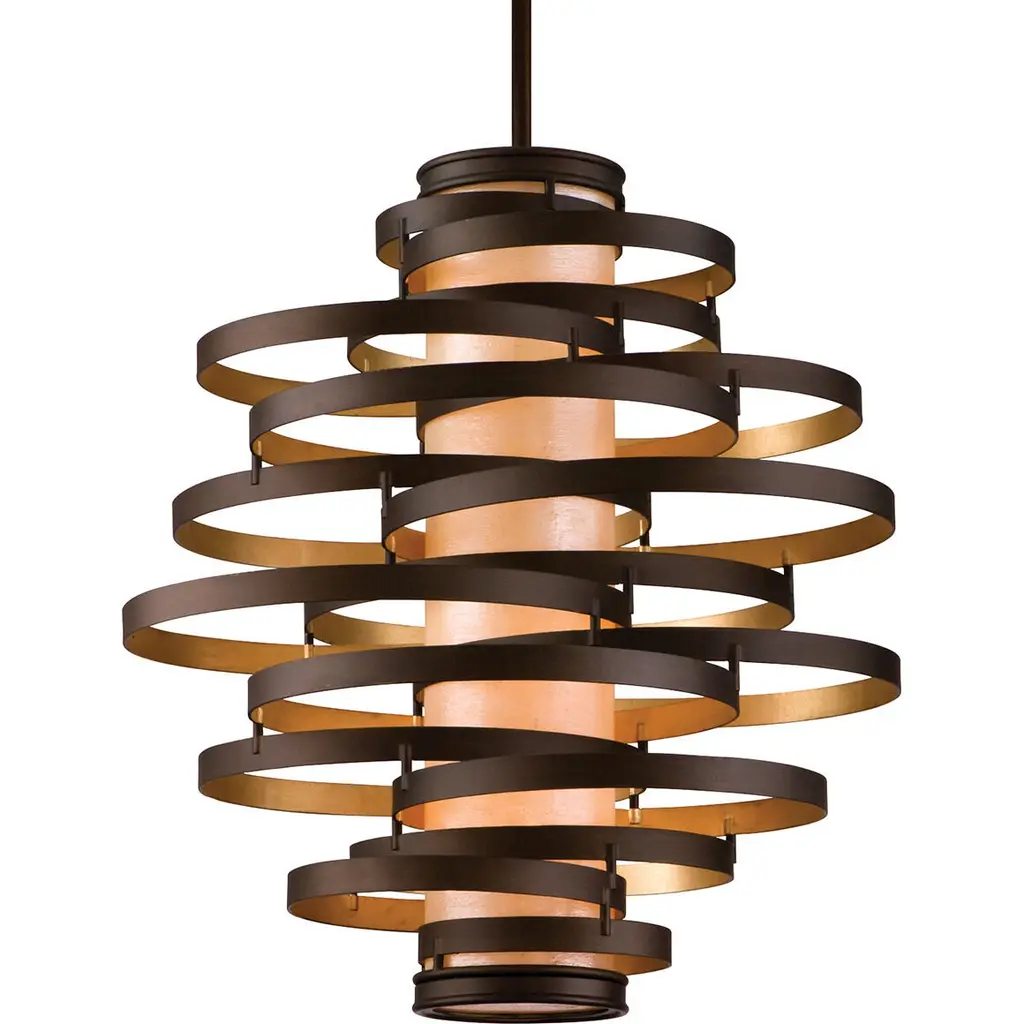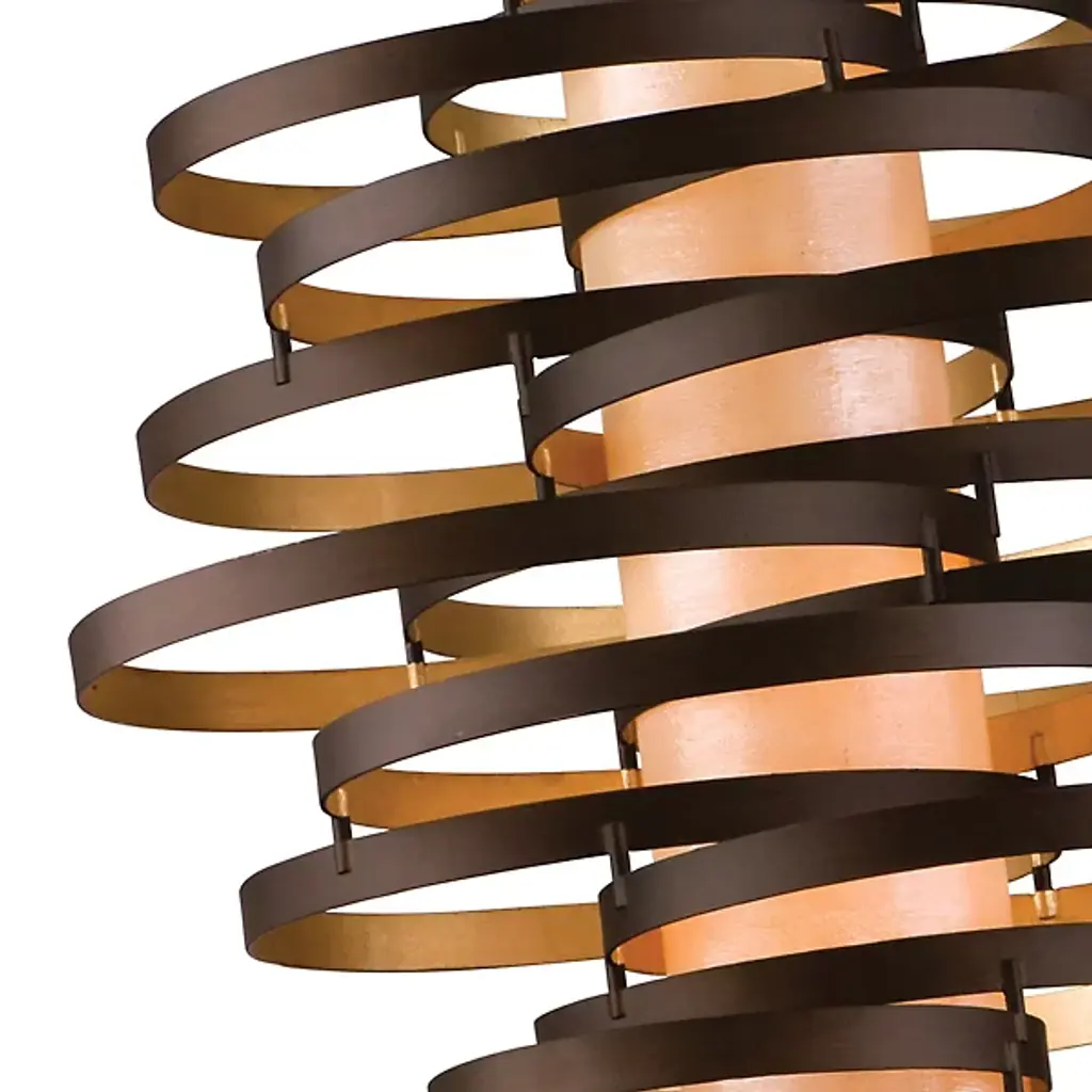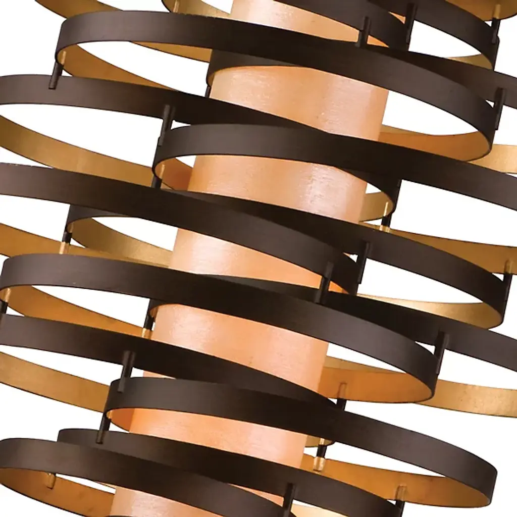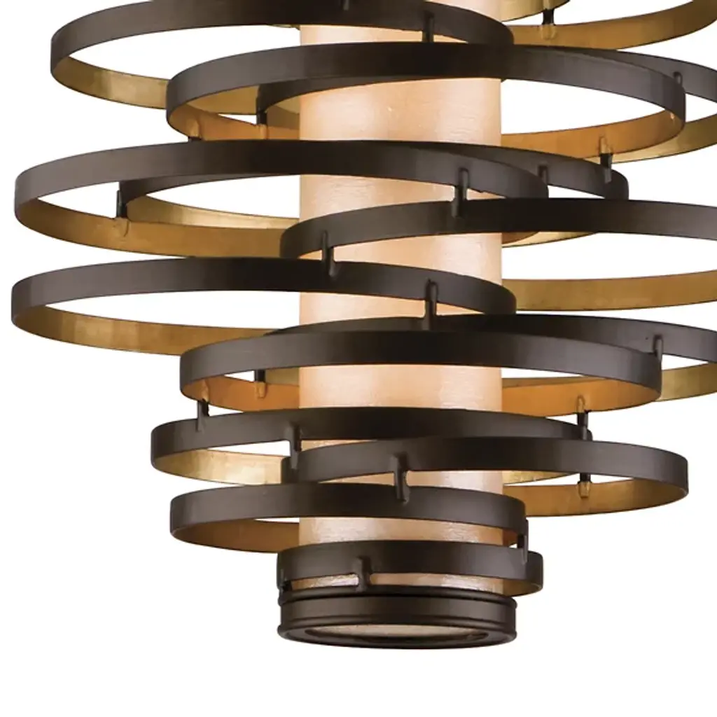 The Corbett Lighting Vertigo Pendant features twisted pieces of metal spiraled around in an uncontrolled fashion, but have no fear each piece is firmly adhered together. Made with a hand crafted iron body and fiber glass shade, this pendant will light your space in a dynamic fashion just as the name implies.