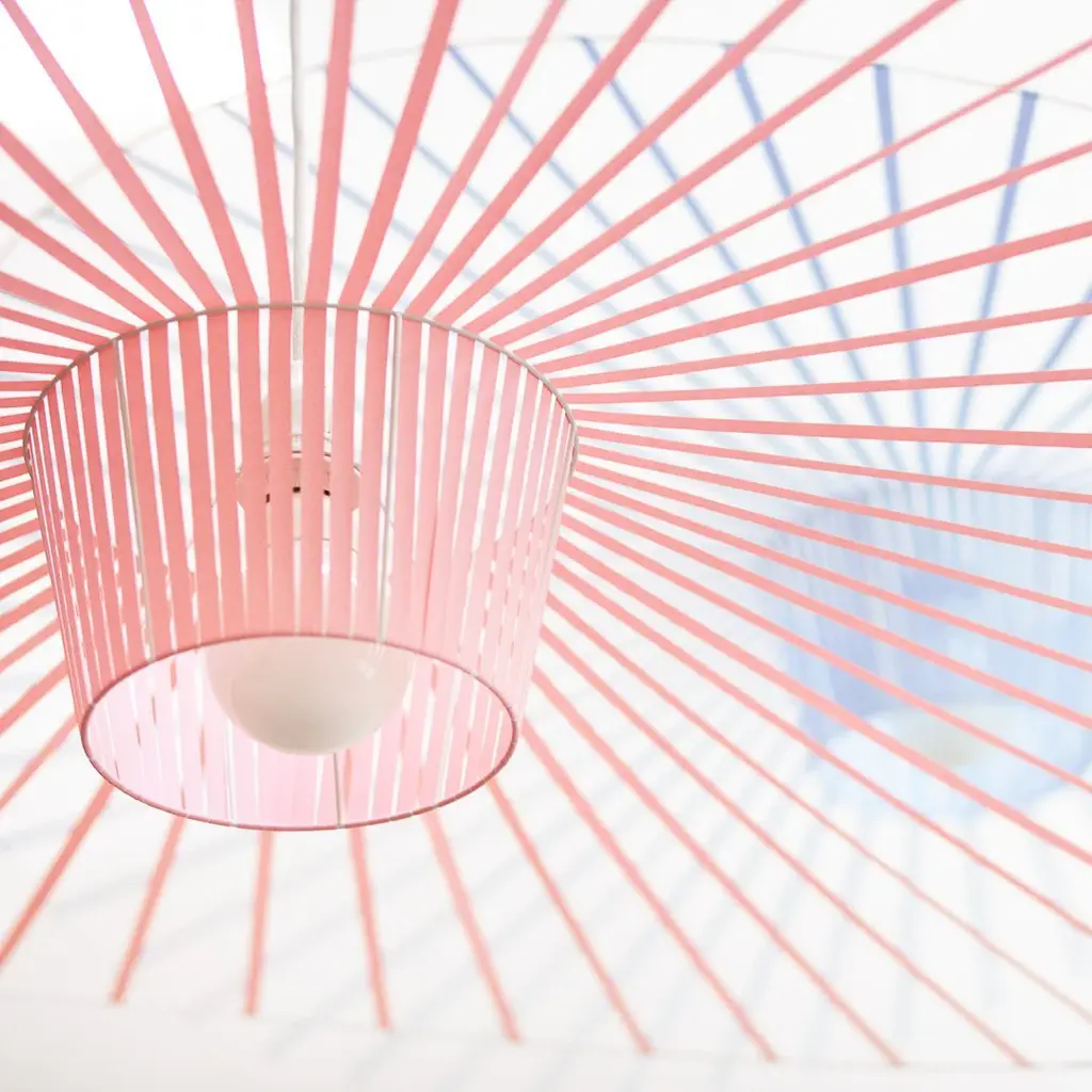 VERTIGO is a "hut lamp" in the words of its designer; both aerial and graphic, it adapts to large volumes as small, where it recreates a clean and intimate space. Ultra lightweight fiberglass structure, tensioned by polyurethane ribbons velvety touch, this suspension exerts a real fascination when it comes alive and comes alive with the currents of air.