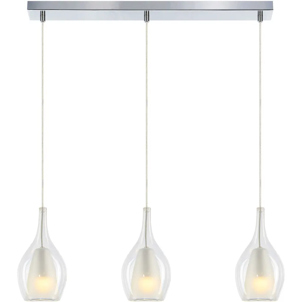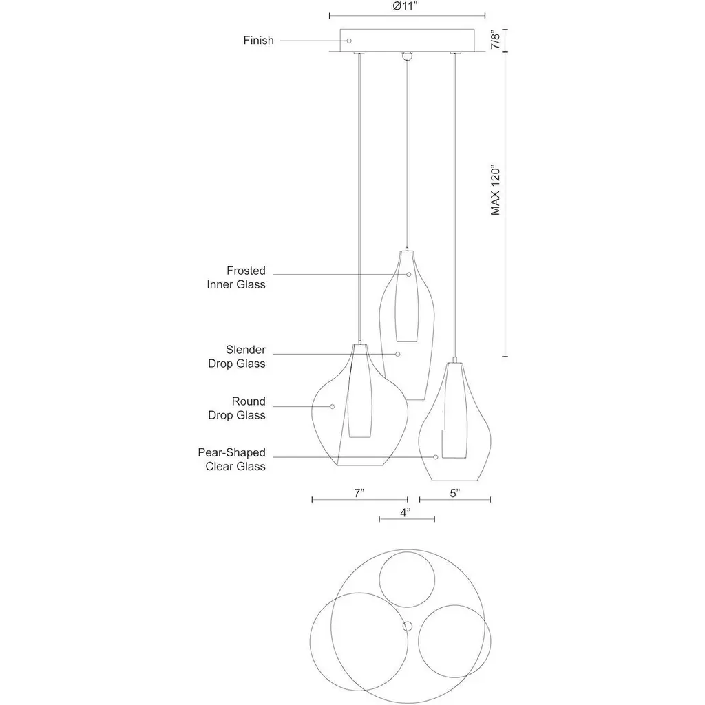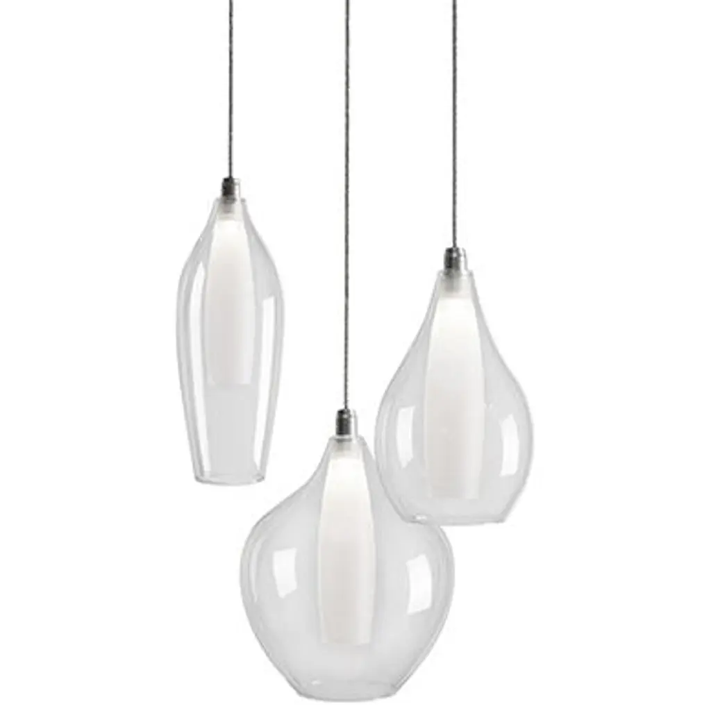 Simplistic elegant round multi LED pendant with three styles of clear outer glass and frosted inner glass each set together as one piece (slender drop, pear shaped and round drop glass shades). New patent pending socket design and Kuzco SSL wire allow this fixture to be 12V AC LED. Metal details in chrome finish. Available in three different glass styled single pendants and a variety of multi-pendant options, see series for full details.