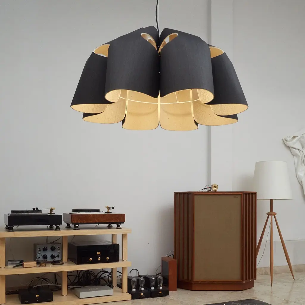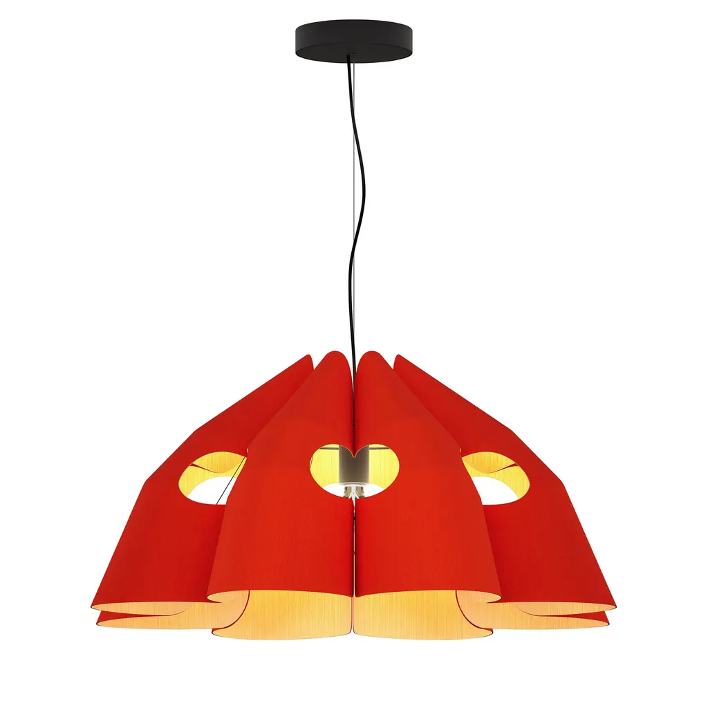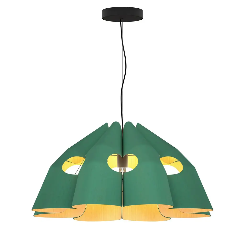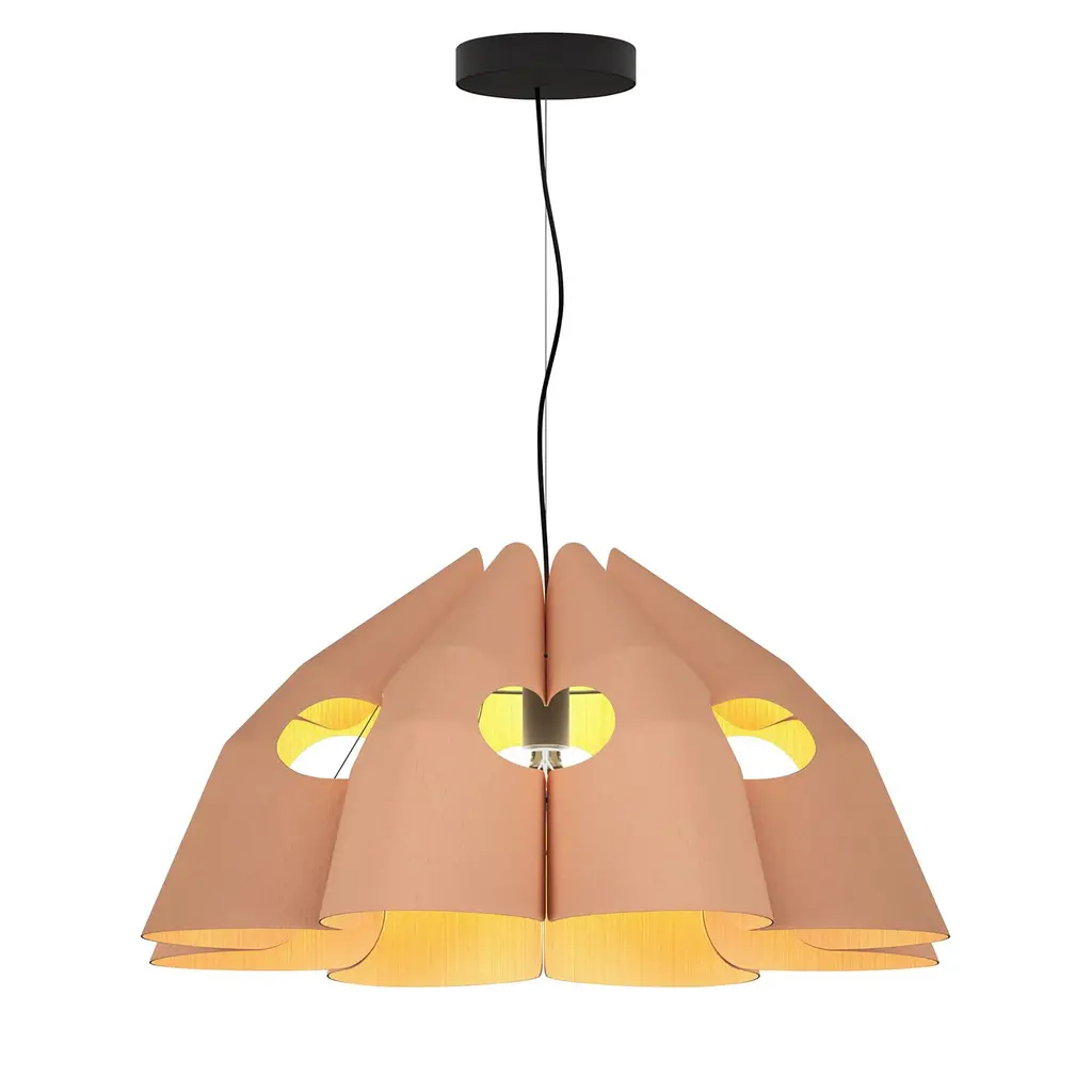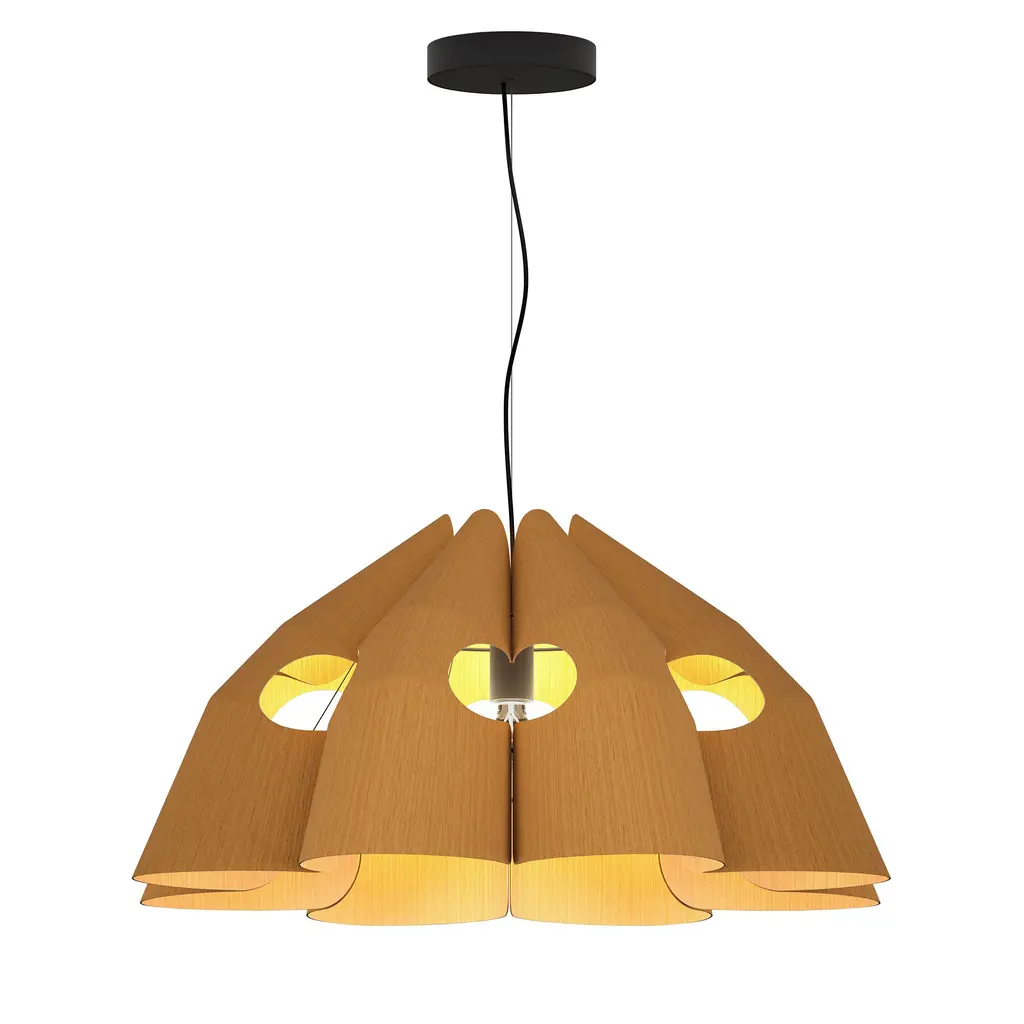 The Victoria Pendant Light from Bruck Lighting exhibits a sustainable wood shade to add a natural aesthetic to your space. Colorful swirls of thin wood veneer create a visual statement highlighted by the warm glow of ambient light. The authentic wood grain is unique to each piece and every fixture’s character is nothing short of livable art. Station above a kitchen countertop or dining room table for a sculptural accent that is equal parts grounding and effervescent. Highlights