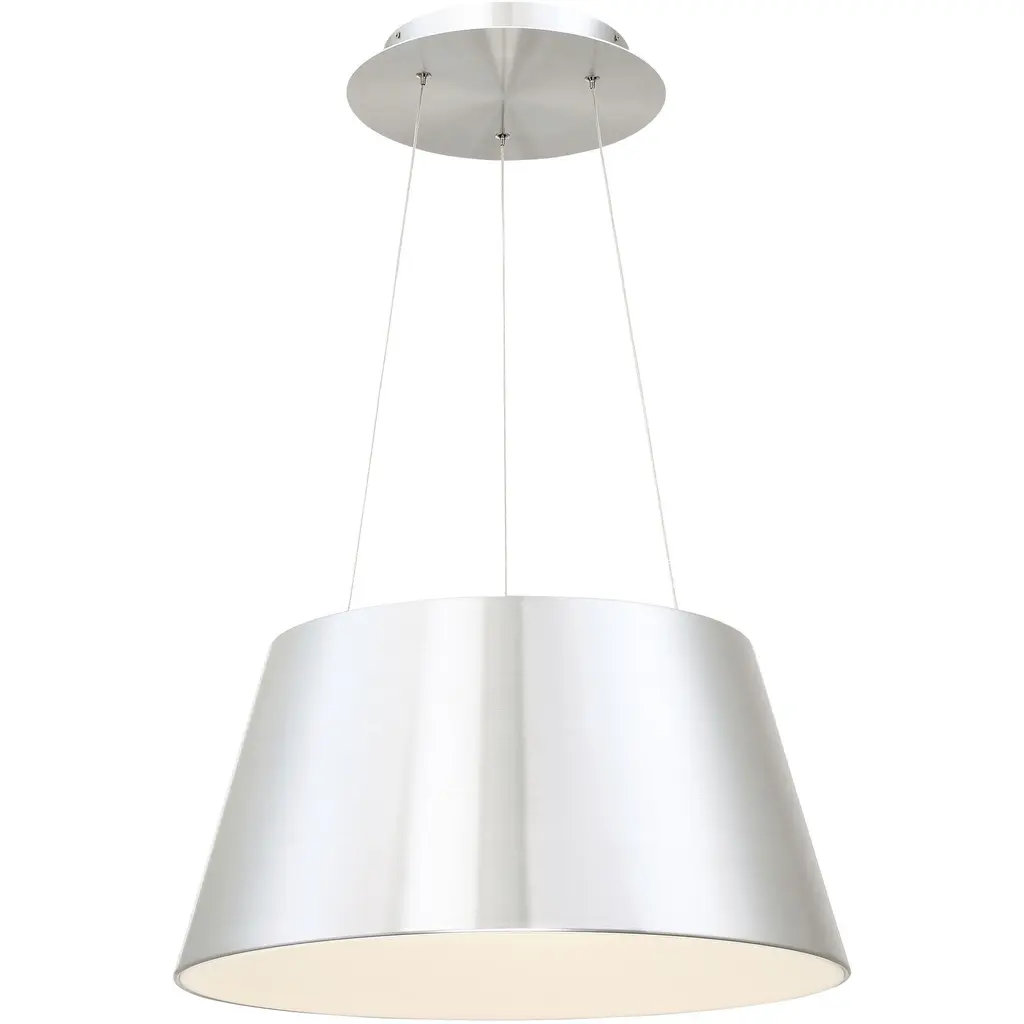 Breathe some life into your living space with the Vida LED Drum Pendant by dweLED. Its tapered, spun Aluminum body offers a clean, quality appearance that houses a recessed Frosted Acrylic diffuser with integrated LEDs. The fixture's funneled shape provides a more direct lighting experience while effectively concealing its source, creating an ambiance that is both functional and pleasant.