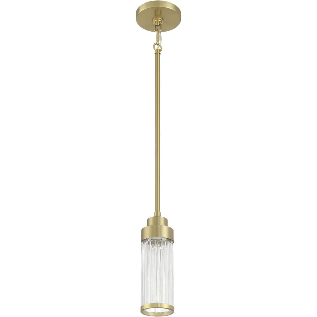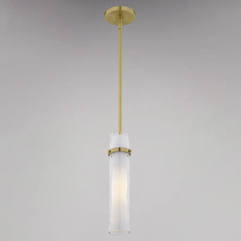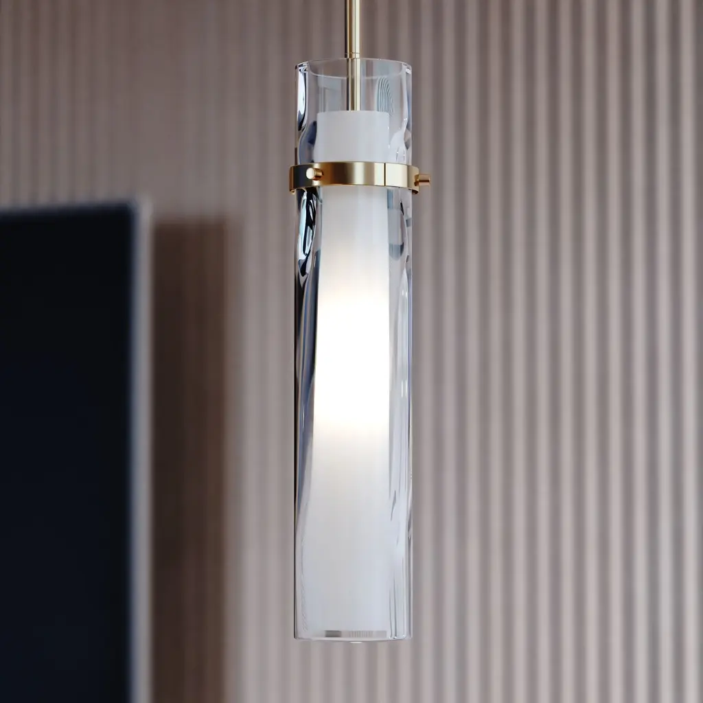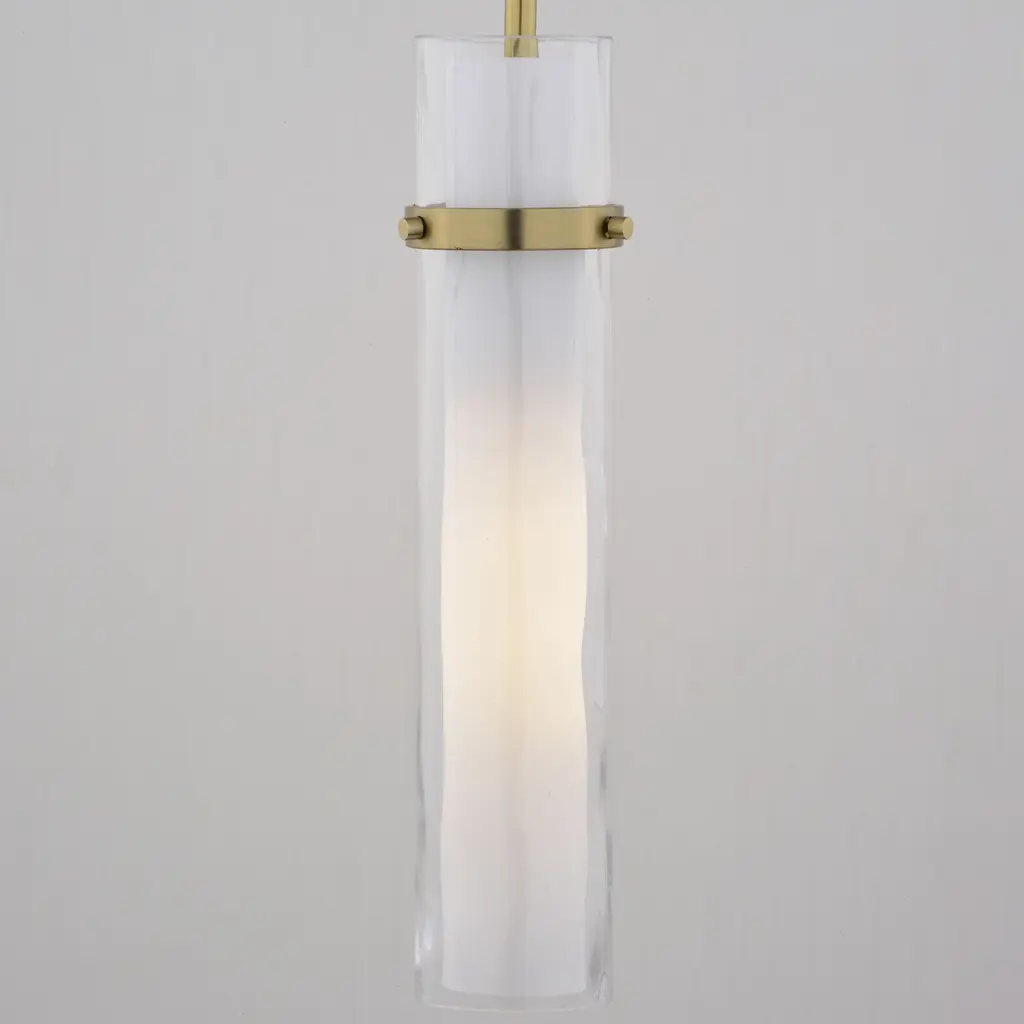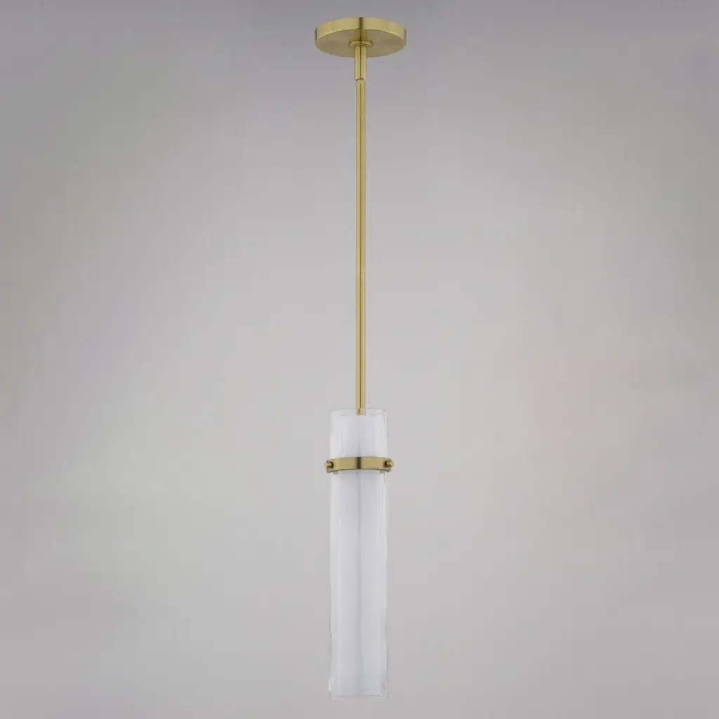 The Vilo collection is a perfect blending of simplicity and sophistication. Flat planes and bands of golden brass are a striking compliment to the more softly defined columns of water glass. Ample light emanates from the vertical glass shades creating a dramatic effect. These fixtures offer a classy touch to any contemporary space in your home. Install this mini pendant individually or in a group ideal for kitchens, dining areas, or bar areas. Height is adjustable with the included down rods compatible with sloped ceilings.