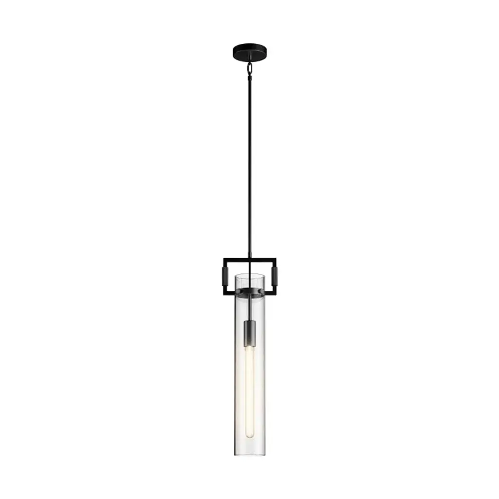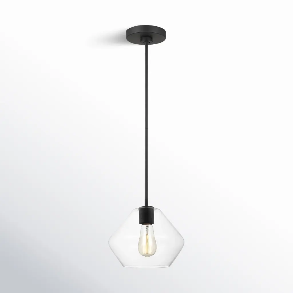 The Vineyard collection features a simple and sophisticated design with square tubing and glass bobech. Comes in a matte black finish (1 light pendant)