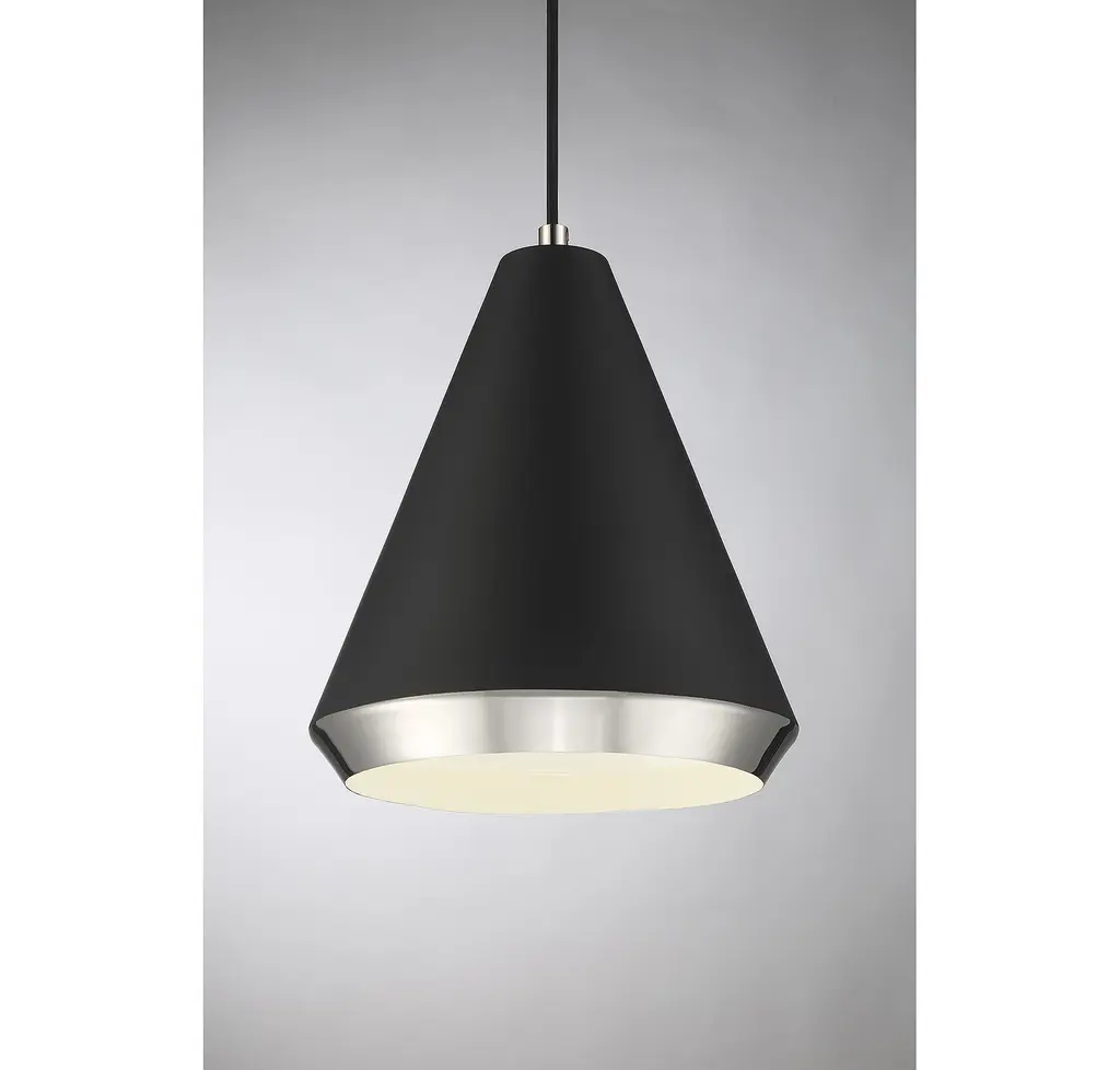 Get contemporary style with a vintage twist when you get this Meridian 1-light pendant, featuring a solid conical shade finished in matte black with polished nickel accents. 12" height, 10" width. Max height 132". Max 60 watt bulb, standard size A19 bulb recommended. LED bulb compatible.