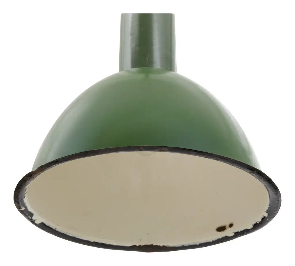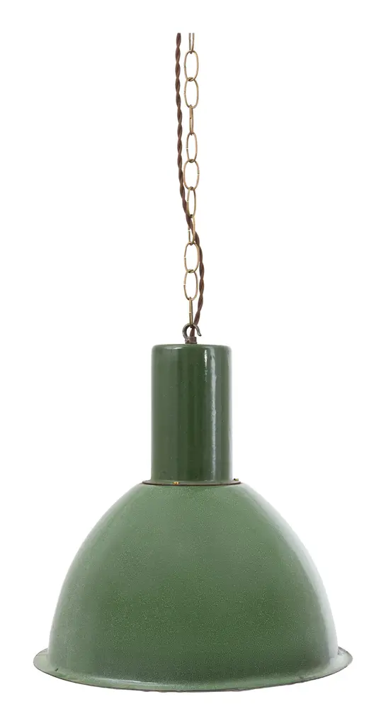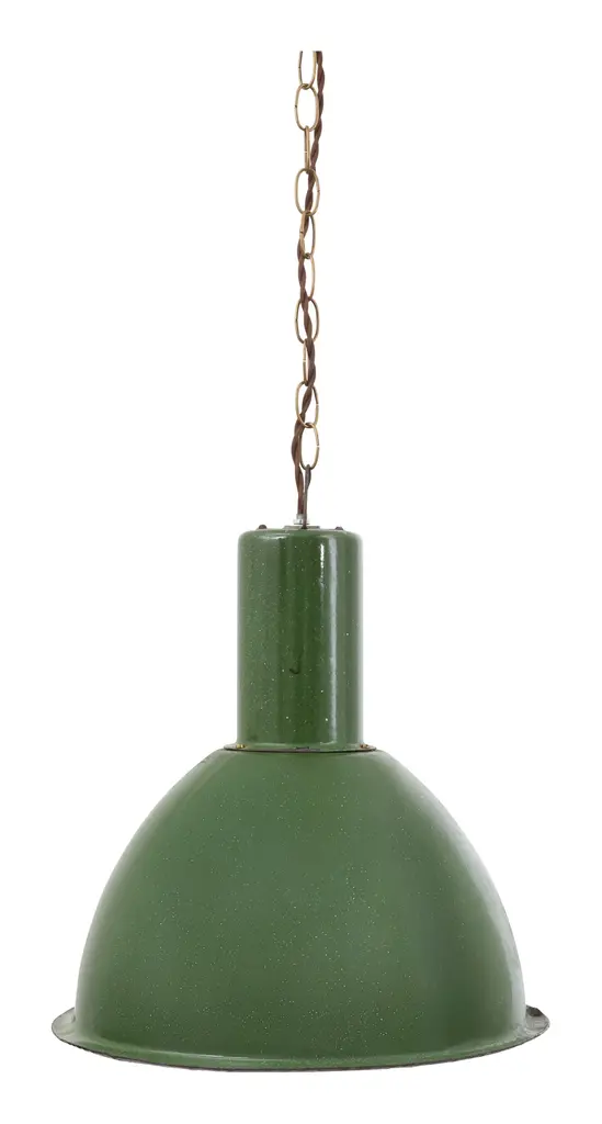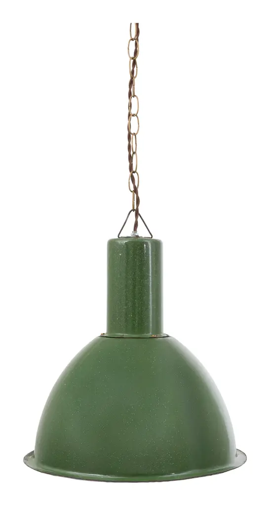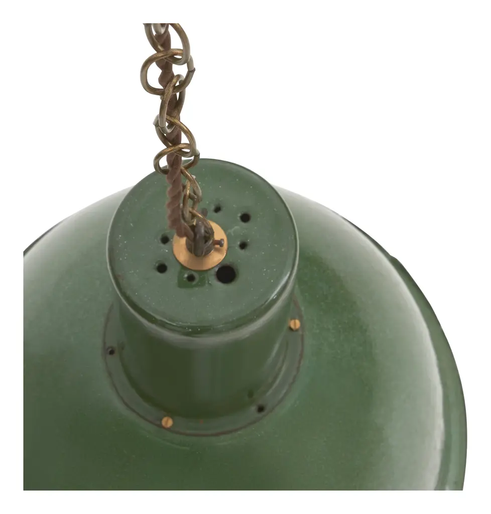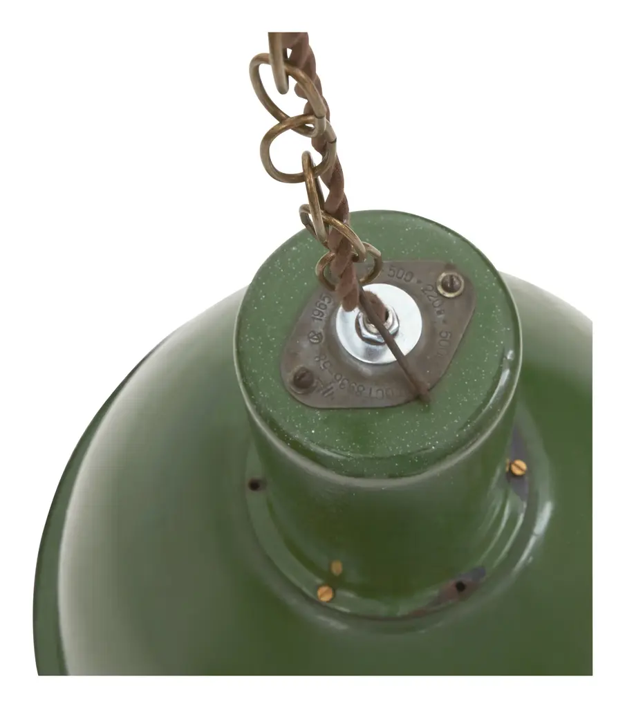 •patinaed green enamel finish•antique brass chain and canopy•rewired with brown twisted cotton cord•20th century•belgium Dimensions•15.75" diameter x 15.75"H •up to 3 available (pending availability)