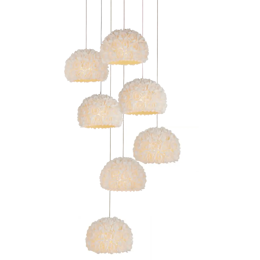 The Virtu 7-Light Round Multi-Drop Pendant has beautifully composed shades around which clamrose shells are fashioned to look like rosebuds; each petal hand-placed to make this an artisanal offering. The way the illumination wafts through the shade and surrounds the shells is a design detail of note with this lovely nature-inspired luminary.