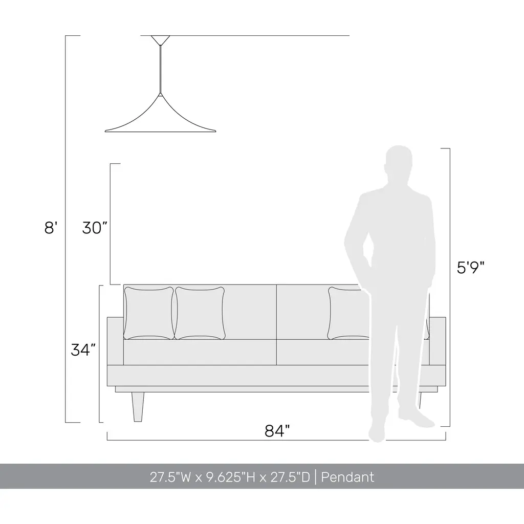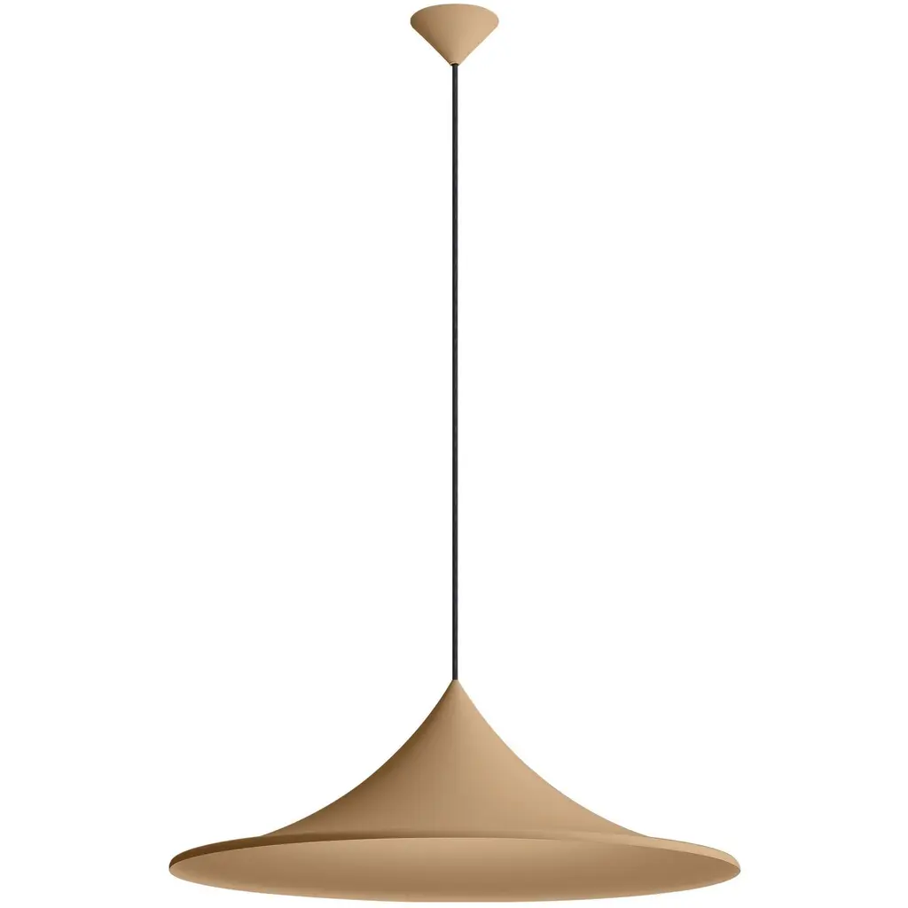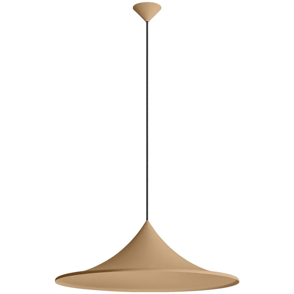 Bring warmth and sophistication into your home with the Golden Lighting Vistara 1-light 28in Pendant in Latte. Featuring a metal shade and a Latte frame, it creates a welcoming atmosphere.This pendant light showcases a metal shade, defined by its smooth, conical shape, offering highly functional lighting with a sophisticated touch. The finish is a creamy light brown-beige hue with a velvety matte surface, beautifully absorbing light to create a calming ambiance.Perfect for indoor spaces not subject to moisture, such as bedrooms, living rooms, and hallways, the fixture is sloped-ceiling compatible and has an adjustable height, allowing you to customize its length from 12.375" to 132.375".Overall Dimensions: 27.5"W x 9.63"H x 27.5"D. Requires 1 E26 Medium base bulb (not included) with a maximum wattage of 60.Elevate your space with the Golden Lighting Vistara pendant, combining expert craftsmanship with timeless appeal.