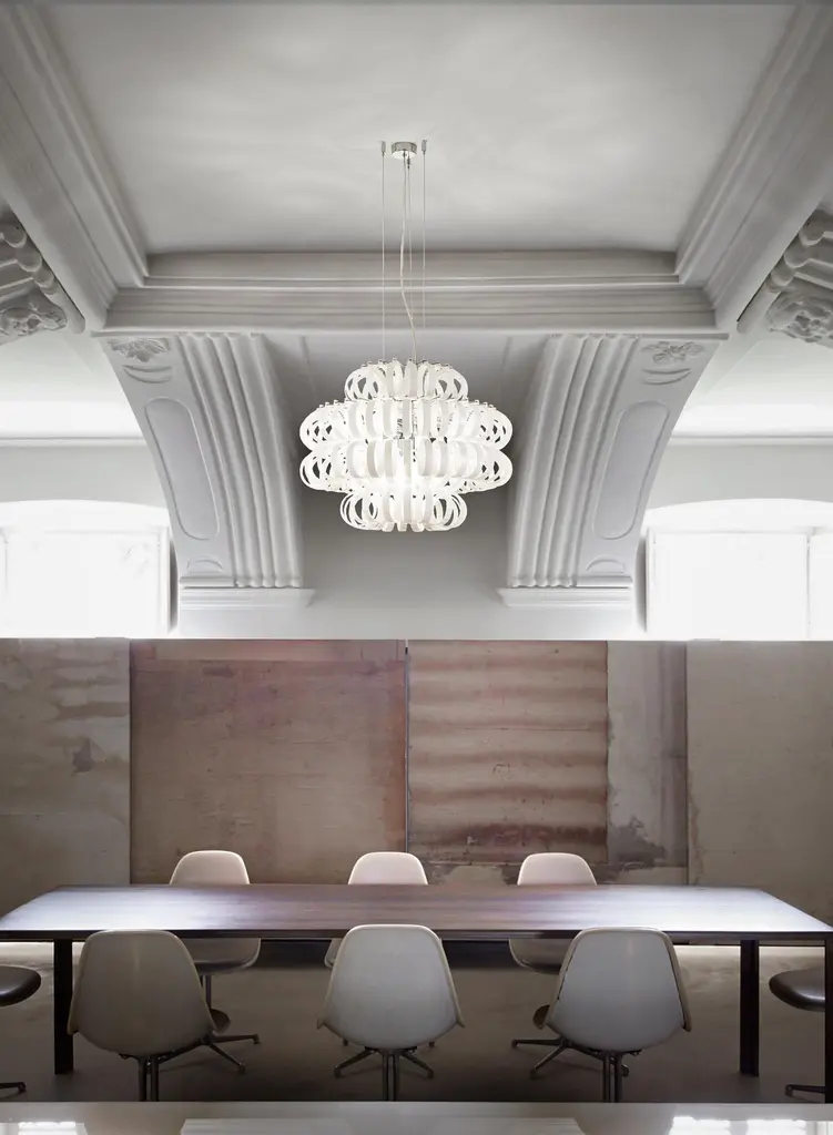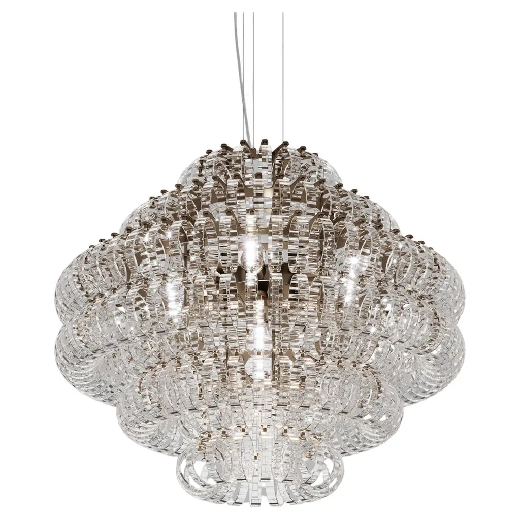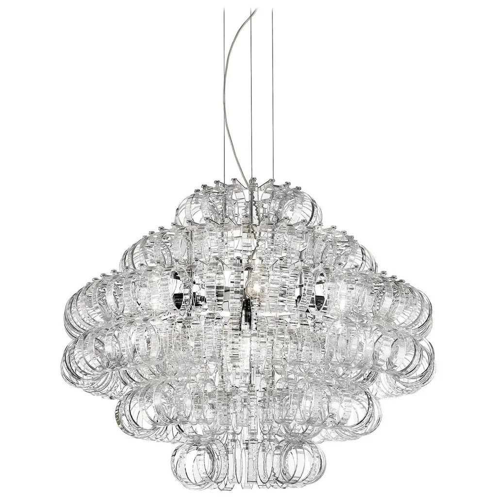One ring, infinite combinations. The concept of the Ecos collection is just in one element: the glass ring. The chromatic and texture variations that the designers Renato Toso, Noti Massari e Associati have been able to obtain from this simple element are several. That makes the collection extremely customizable in terms of shapes and sizes, for a truly original lighting. Rigadin white or crystal colour glass. Metal parts finishing in satin bronze and chrome.Specifications:Material: Glass, chromeLight source: E26 ULNo of bulbs: 4×60W E26 UL (120V/60HZ)Dimmer: DIM 1Year: 2007Glass finish: Crystal StripedFrame finish: Glossy chromeDimensions: Ø 60 x 45 H cmCable length: 200 cmAvailable in other glass finish option: White StripedAvailable in other frame finish option: Matt bronze 2Available in other size options: Small (Ø 30cm), Large ( Ø 85cm)Please inquire about customization options.