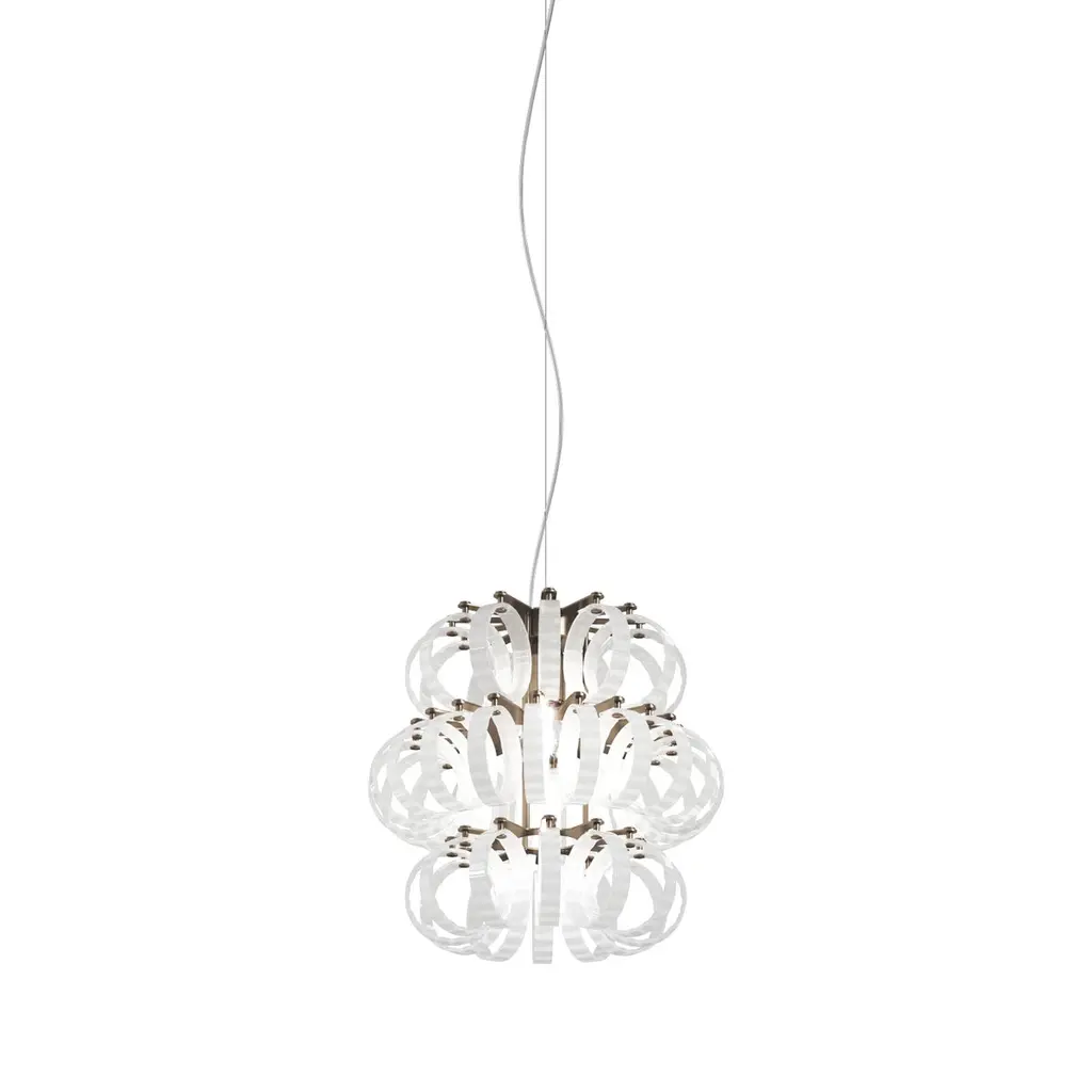 One ring, infinite combinations. The concept of the Ecos collection is just in one element: the glass ring. The chromatic and texture variations that the designers Renato Toso, Noti Massari e Associati have been able to obtain from this simple element are several. That makes the collection extremely customizable in terms of shapes and sizes, for a truly original lighting. Rigadin white or crystal colour glass. Metal parts finishing in satin bronze and chrome.Specifications:Material: Glass, MetalLight source: E26 ULNo of bulbs: 1×60W E26 UL (120V/60HZ)Dimmer: DIM 1Year: 2007Glass finish: White StripedFrame finish: Matt bronze 2Dimensions: Ø 35 x 35 H cmCable length: 200 cmAvailable in other glass finish option: Crystal StripedAvailable in other frame finish option: Glossy chromeAvailable in other size options: Medium (Ø 60cm), Large ( Ø 85cm)Please inquire about customization options.