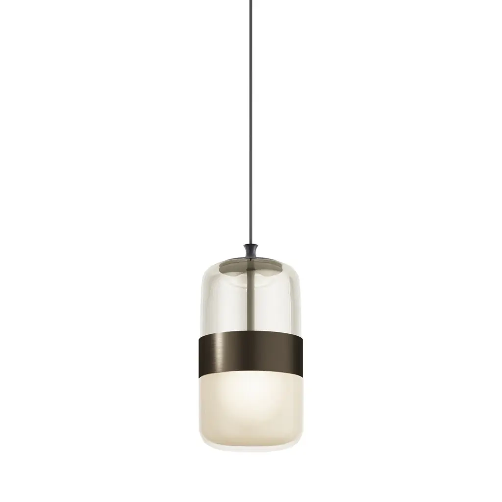 Collection of lamps in blown glass available in transparent and three exclusive colors combined with different finishes of the metal ring. The glass is blown in one piece but the particular handcraft process makes the color transparent in the upper part and diffuser in the bottom part.Light source: 1x60W E26."