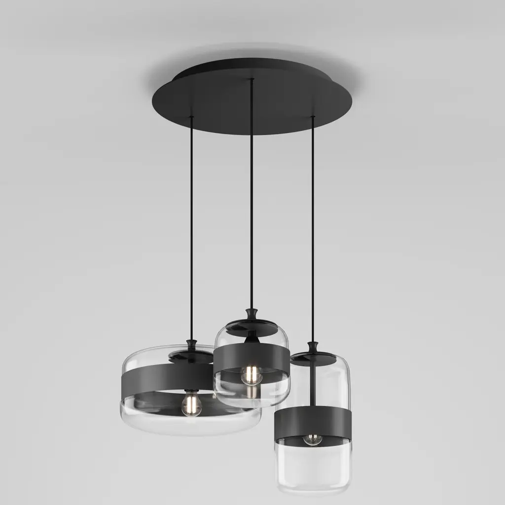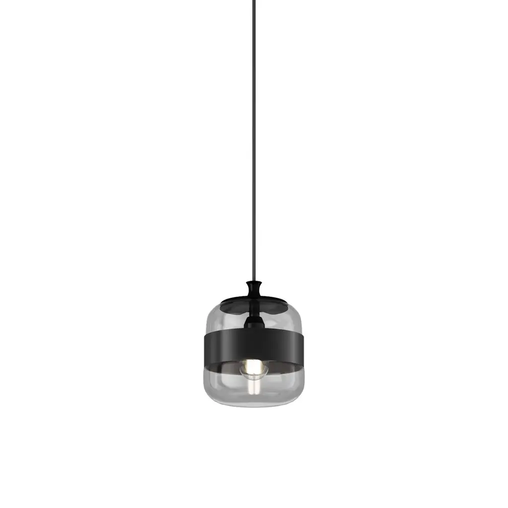A collection of lamps made from a single piece of blown glass, whose particular workmanship, though, allows a double chromatic effect: transparent at the top, satin effect at the bottom. The following combinations of glass with metal ring are now available: white glass combined with matt black ring, smoky glass with brown ring, amber glass with painted brass ring. A new transparent crystal glass finish with copper or matt black ring is also available.Specifications:Material: GlassLight source: LED L22CC ULNo of bulbs: 1x12W LED L22CC UL (35 V)Dimmer: DIM 2Lumens: 1500 lmKelvin: 2700 KYear: 2015Glass finish: Crystal BlackFrame finish: Matt Black 1Dimensions: Ø 20 x 24 H cmCable length: 200 cmAvailable in other glass finish options: Amber Brass, White Black, Smoky Brown, Crystal CopperAvailable in other frame finish option: Rame/NeroAvailable in other light source options: E26 UL - $ 754, LED L23CC UL - $ 964, LED L32CC UL - $ 964, LED L33CC UL - $ 964Available in other No. of bulb option: 1×60W (120V/60HZ) for E26 UL Available in other lumens option: 1600 lm for LED L32CC UL, LED L33CC ULAvailable in other kelvin option: 3000 K for LED L32CC UL, LED L33CC ULAvailable in other dimmer options: DIM 1 for E26 UL; DIM 3 for LED L23CC UL, LED L33CC ULAvailable in other size options: Medium (Ø 23cm), Large (Ø 40cm)Please inquire about customization options.
