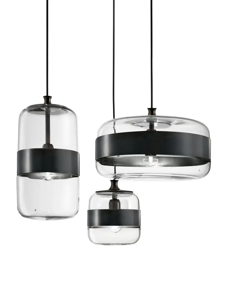 A collection of lamps made from a single piece of blown glass, whose particular workmanship, though, allows a double chromatic effect: transparent at the top, satin effect at the bottom. The following combinations of glass with metal ring are now available: white glass combined with matt black ring, smoky glass with brown ring, amber glass with painted brass ring. A new transparent crystal glass finish with copper or matt black ring is also available.Specifications:Material: GlassLight source: LED L22CC ULNo of bulbs: 1x12W LED L22CC UL (35 V)Dimmer: DIM 2Lumens: 1500 lmKelvin: 2700 KYear: 2015Glass finish: White BlackFrame finish: Matt Black Dimensions: Ø 23 x 44 H cmCable length: 200 cmAvailable in other glass finish options: Crystal Copper, Smoky Brown, Crystal Black, Amber BrassAvailable in other frame finish option: Rame/NeroAvailable in other light source options: E26 UL - $ 1104, LED L23CC UL - $ 1278, L32CC UL - $ 1278, L33CC UL - $ 1278Available in other No. of bulb option: 1×60W (120V/60HZ) for E26 UL Available in other lumens option: 1600 lm for LED L32CC UL, LED L33CC ULAvailable in other kelvin option: 3000 K for LED L32CC UL, LED L33CC ULAvailable in other dimmer options: DIM 1 for E26 UL; DIM 3 for LED L23CC UL, LED L33CC ULAvailable in other size options: Small (Ø 20cm), Large (Ø 40cm)Please inquire about customization options.