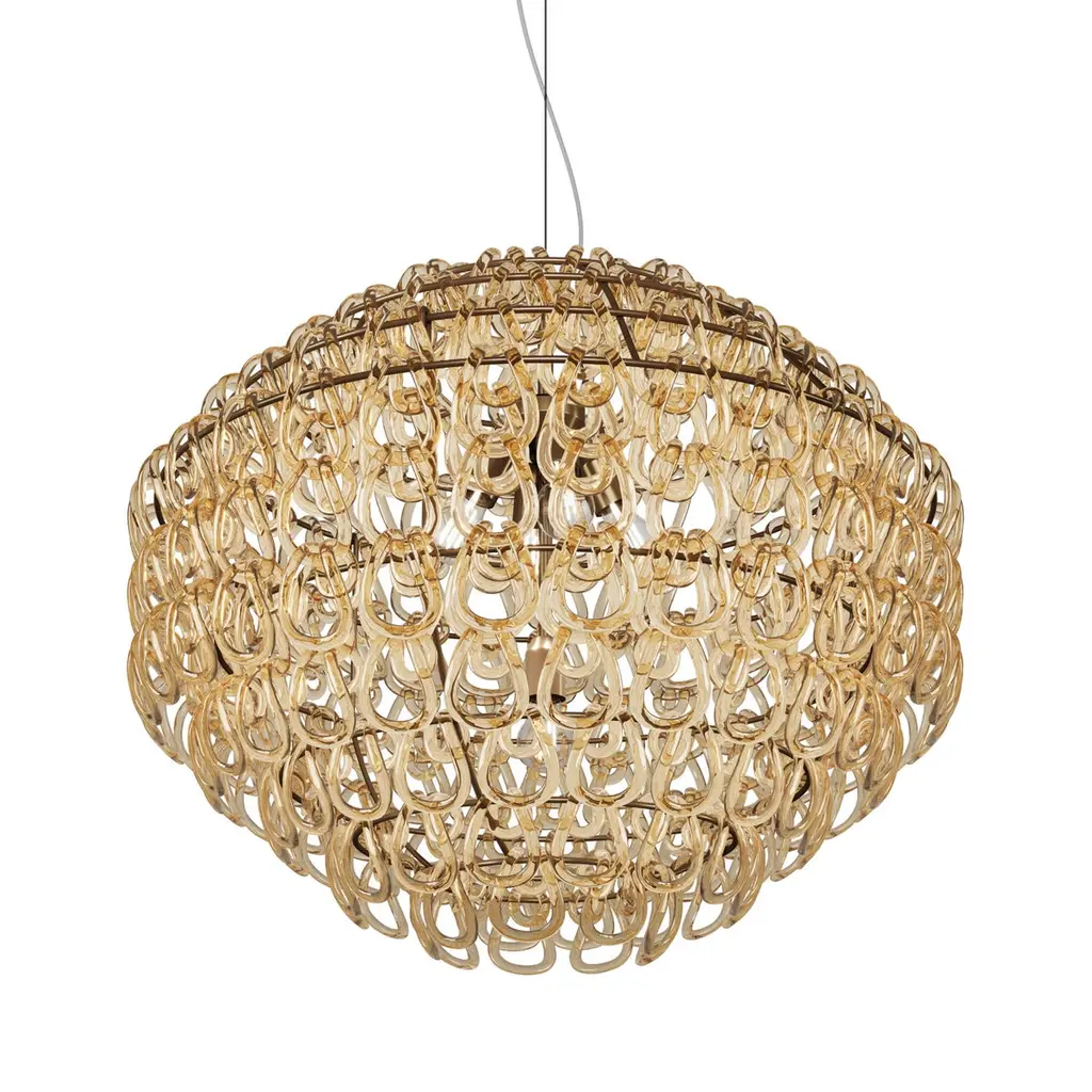 A pure element: the crystal hook. It is the intuition of a master of Italian design, Angelo Mangiarotti, who in 1967 created the best seller of the Vistosi catalogue, Giogali. An iconic interweaving applied to the version one prefers. Specifications:Material: Glass, MetalLight source: E26 UL No of bulbs: 5x60W E26 UL (120V/60HZ)Dimmer: DIM 1Year: 1967Glass finish: Crystal AmberFrame finish: Matt bronze 1Dimensions: Ø 85 x 70 H cmCable length: 200 cmAvailable in other glass finish options: White, Crystal Silver, Crystal Bronze, Crystal Smoky, Black, Crystal Black Nickel, Crystal Gold, Crystal Copper, Crystal TransparentAvailable in other frame finish option: Glossy chromeAvailable in other size options: Ø 35, Ø 50, Ø 65, 50x50, Ø 55, 120x60, 120x40x50, 120x40x80, 80x30 cmPlease inquire about customization options.