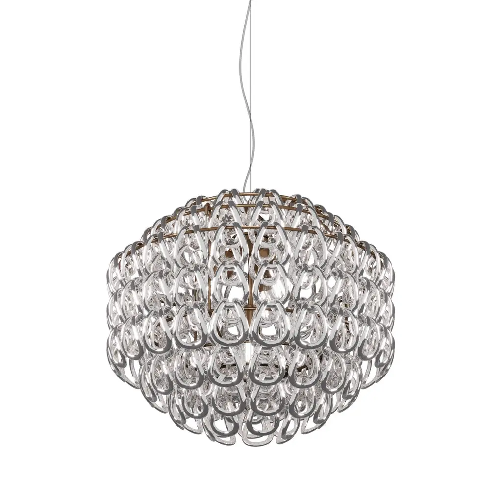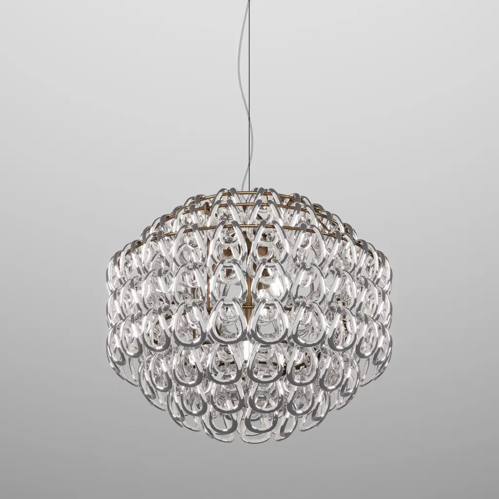 A pure element: the crystal hook. It is the intuition of a master of Italian design, Angelo Mangiarotti, who in 1967 created the best seller of the Vistosi catalogue, Giogali. An iconic interweaving applied to the version one prefers. Specifications:Material: Glass, MetalLight source: E26 UL No of bulbs: 4x60W E26 UL (120V/60HZ)Dimmer: DIM 1Year: 1967Glass finish: Crystal SilverFrame finish: Matt bronze 1Dimensions: Ø 65 x 54 H cmCable length: 200 cmAvailable in other glass finish options: Black, Crystal Amber, Crystal Bronze, Crystal Smoky, Crystal Black Nickel, White, Crystal Gold, Crystal Copper, Crystal TransparentAvailable in other frame finish option: Glossy chromeAvailable in other size options: Ø 35, Ø 50, Ø 85, 50x50, Ø 55, 120x60, 120x40x50, 120x40x80, 80x30 cmPlease inquire about customization options.