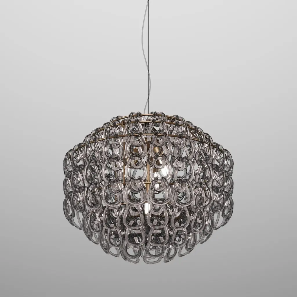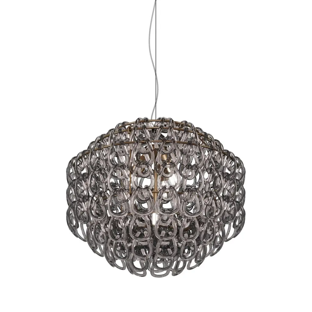 A pure element: the crystal hook. It is the intuition of a master of Italian design, Angelo Mangiarotti, who in 1967 created the best seller of the Vistosi catalogue, Giogali. An iconic interweaving applied to the version one prefers. Specifications:Material: Glass, MetalLight source: E26 UL No of bulbs: 4x60W E26 UL (120V/60HZ)Dimmer: DIM 1Year: 1967Glass finish: Crystal SmokyFrame finish: Matt bronze 1Dimensions: Ø 65 x 54 H cmCable length: 200 cmAvailable in other glass finish options: Black, Crystal Silver, Crystal Amber, Crystal Bronze, Crystal Black Nickel, White, Crystal Gold, Crystal Copper, Crystal TransparentAvailable in other frame finish option: Glossy chromeAvailable in other size options: Ø 35, Ø 50, Ø 85, 50x50, Ø 55, 120x60, 120x40x50, 120x40x80, 80x30 cmPlease inquire about customization options.