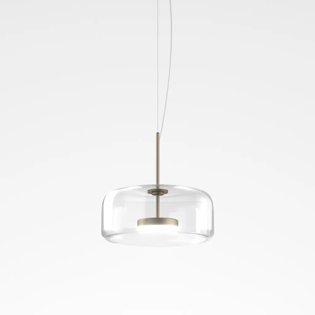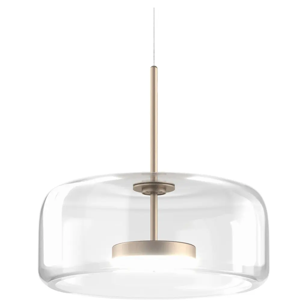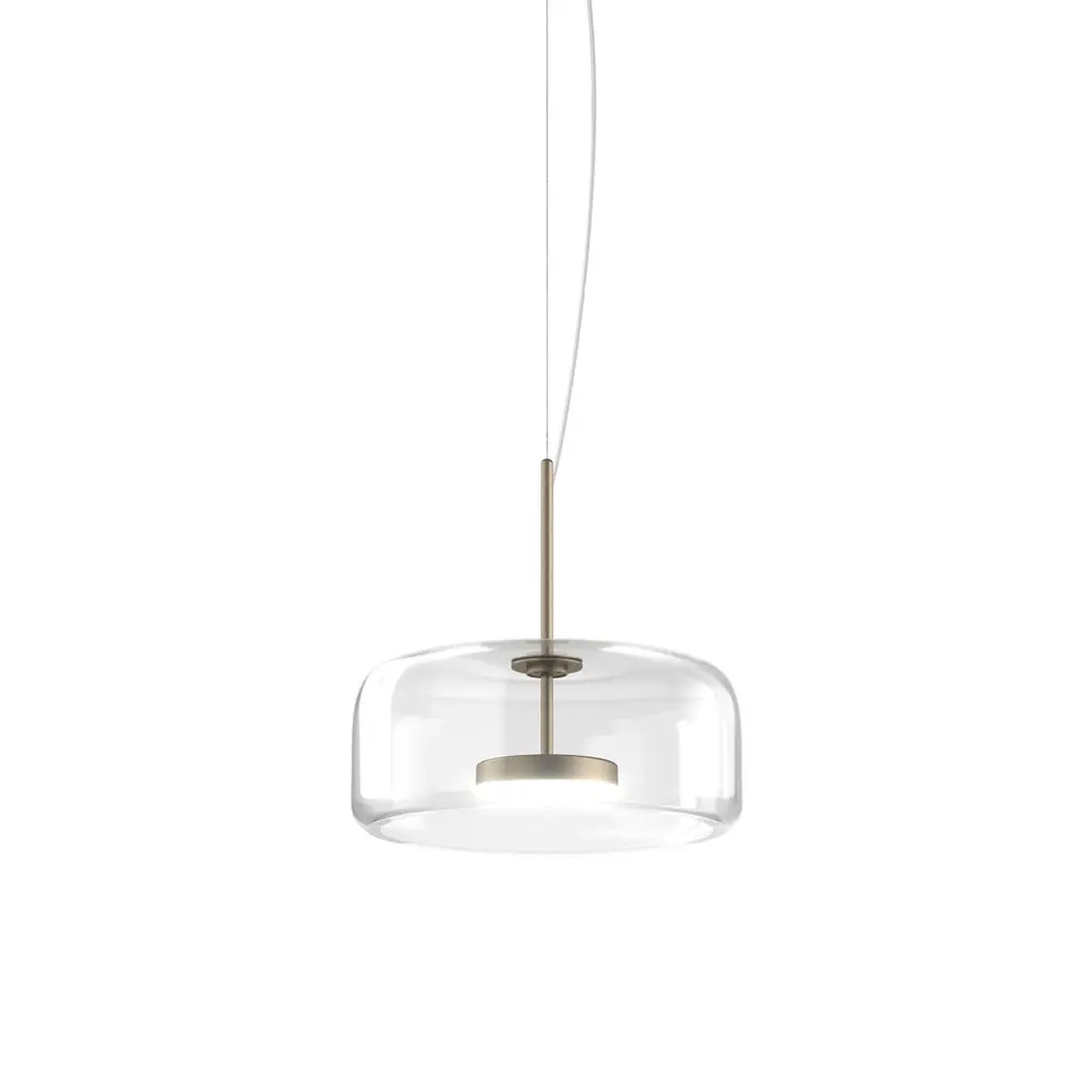 The elegant and delicate look of the blown glass finds a new dimension in Jube. Two glass units placed side by side, so perfectly assembled, that they look like a unique piece. A sinuous lamp, with tone-on-tone colours that give it a precious, vintage mood.Specifications:Material: GlassLight source: LED L2202 ULNo of bulbs: 1x13W L2202 UL (37V)Dimmer: DIM 2Lumen: 2000 lmKelvin: 2700 KYear: 2017Glass finish: Crystal TransparentFrame finish: Matt steelDimensions: Ø 38 x 17 H cmCable length: 200 cmAvailable in other glass finish options: Light Amethyst Transparent, Smoky Transparent, Burned Earth Transparent, Old Green TransparentAvailable in other frame finish option: Matt gold 2Available in other light source options: LED L2302 UL - $ 1278, LED L3202 UL - $ 1278, LED L3302 UL - $ 1278Available in other kelvin option: 3000 KAvailable in other dimmer option: DIM 3Please inquire about customization options.