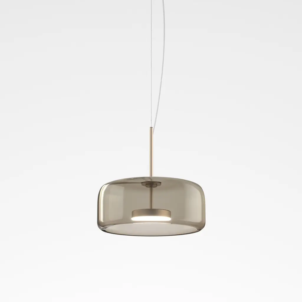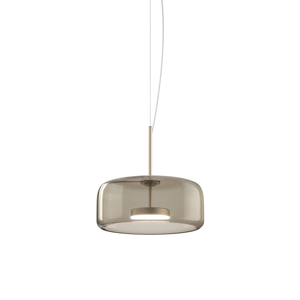 The elegant and delicate look of the blown glass finds a new dimension in Jube. Two glass units placed side by side, so perfectly assembled, that they look like a unique piece. A sinuous lamp, with tone-on-tone colours that give it a precious, vintage mood.Specifications:Material: GlassLight source: LED L2202 ULNo of bulbs: 1x13W L2202 UL (37V)Dimmer: DIM 2Lumen: 2000 lmKelvin: 2700 KYear: 2017Glass finish: Smoky TransparentFrame finish: Matt gold 2Dimensions: Ø 38 x 17 H cmCable length: 200 cmAvailable in other glass finish options: Light Amethyst Transparent, Crystal Transparent, Burned Earth Transparent, Old Green TransparentAvailable in other frame finish option: Matt steelAvailable in other light source options: LED L2302 UL - $ 1278, LED L3202 UL - $ 1278, LED L3302 UL - $ 1278Available in other kelvin option: 3000 KAvailable in other dimmer option: DIM 3Please inquire about customization options.