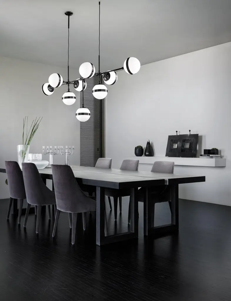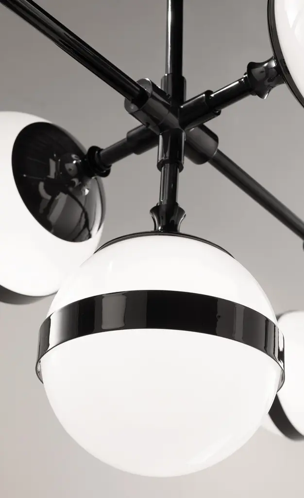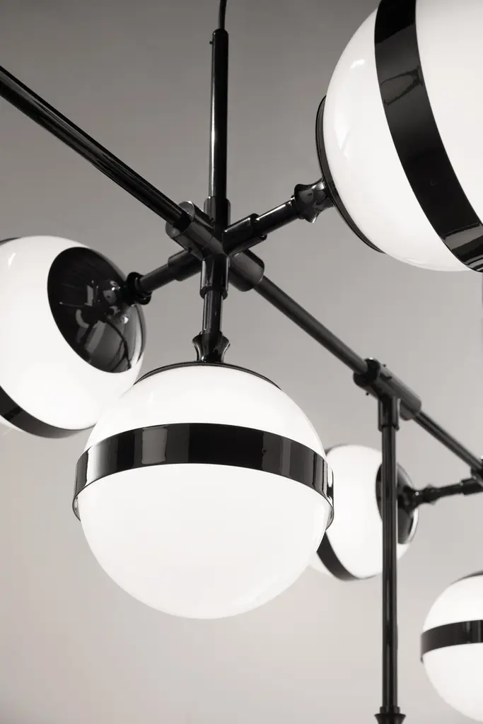 The white, blown handmade glass together with the glossy black metal, with a lead-effect treatment, interpret the polarity between black and white with the lightness of a rational and elegant design. With an impressive installation the lighting system lights up the Museum Café at Peggy Guggenheim Museum in Venice.Light source: 9x60W G9.