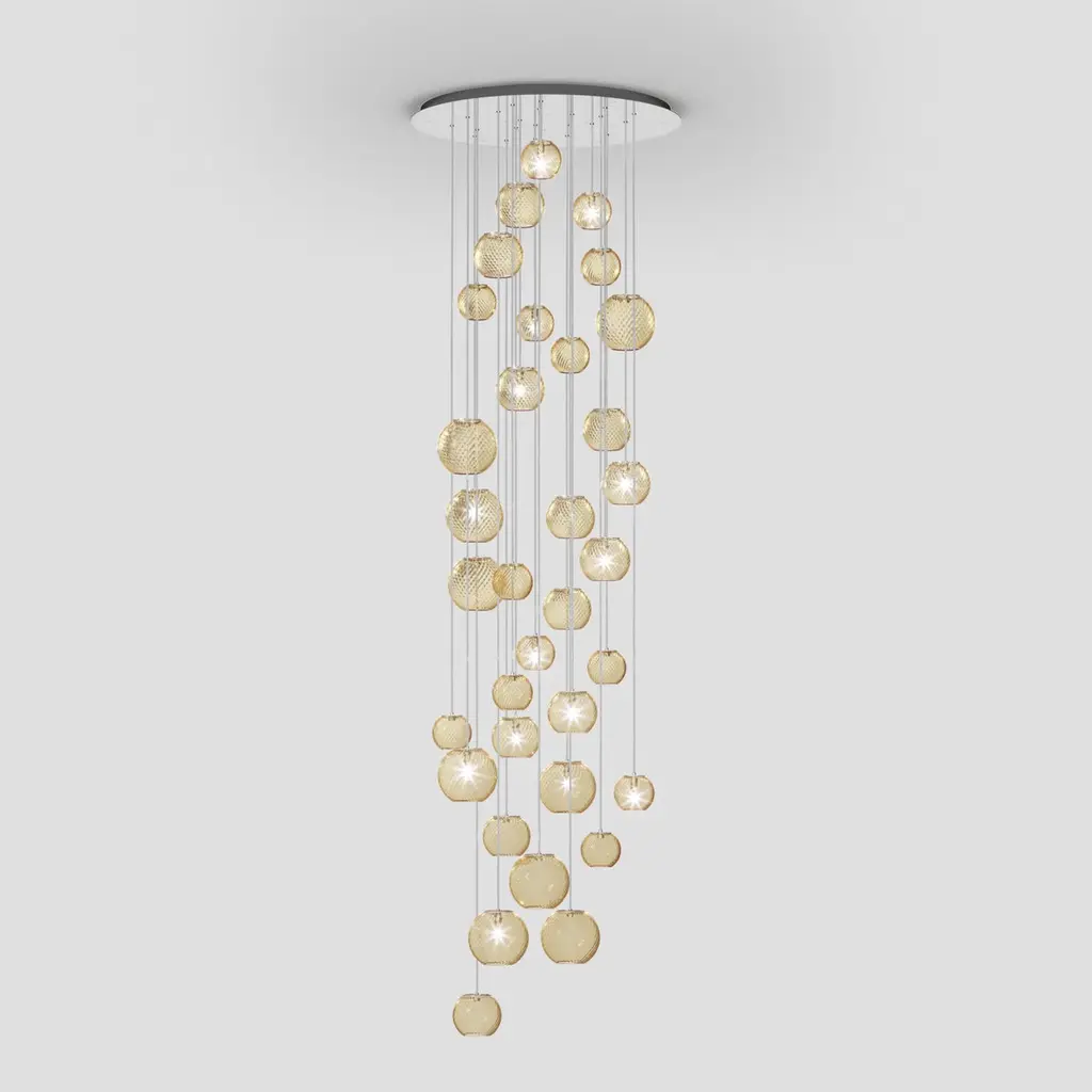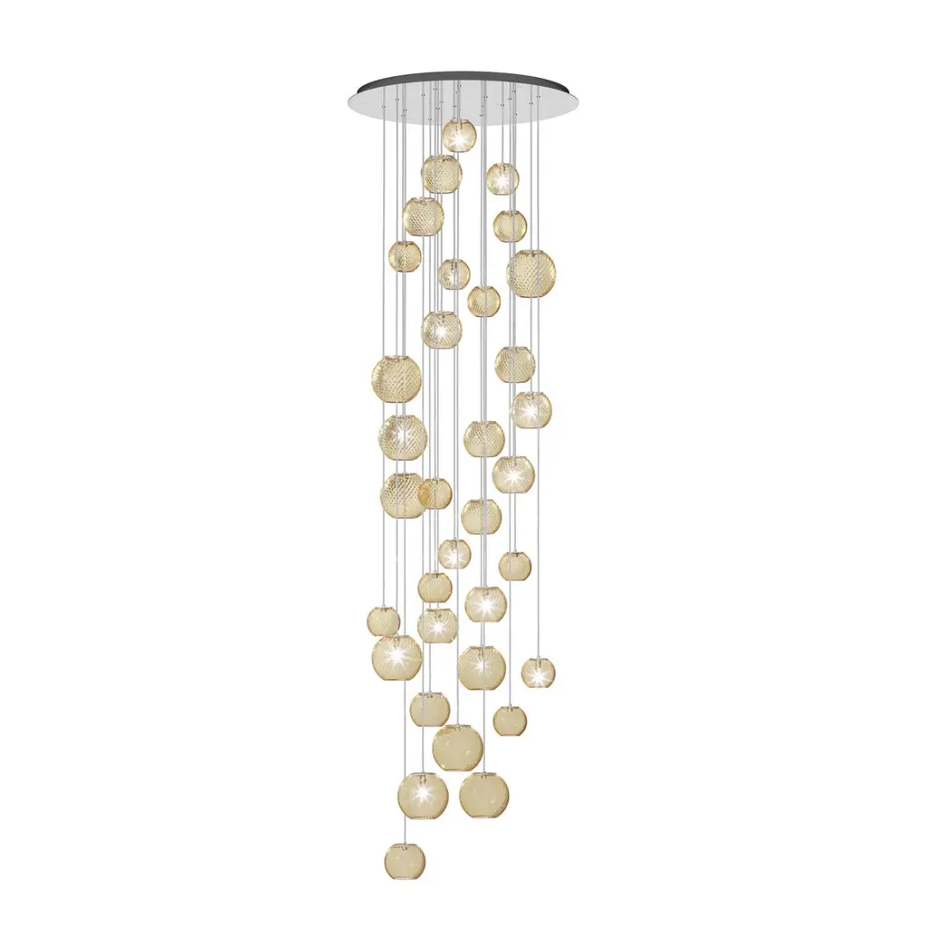 Spherical blown glass elements available in three sizes and four rigadin colours, with and without lighting source. The special design allows the vertical installation of several glass elements and infinite customized combinations.Specifications:Material: GlassLight source: G9 ULNo of bulbs: 12×40W G9 UL (120V/60HZ)Dimmer: DIM 1Year: 2015Glass finish: Amber stripedFrame finish: Mirrored steelDimensions: Ø 82 x 250 H cmCable length: 50 cmAvailable in other glass finish options: White striped, Crystal striped, Smoky stripedAvailable in other frame finish options: Glossy white, Satin nickel Please inquire about customization options.