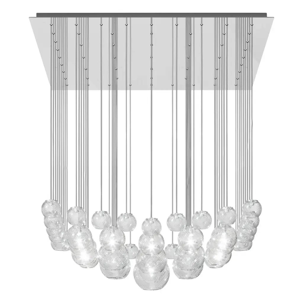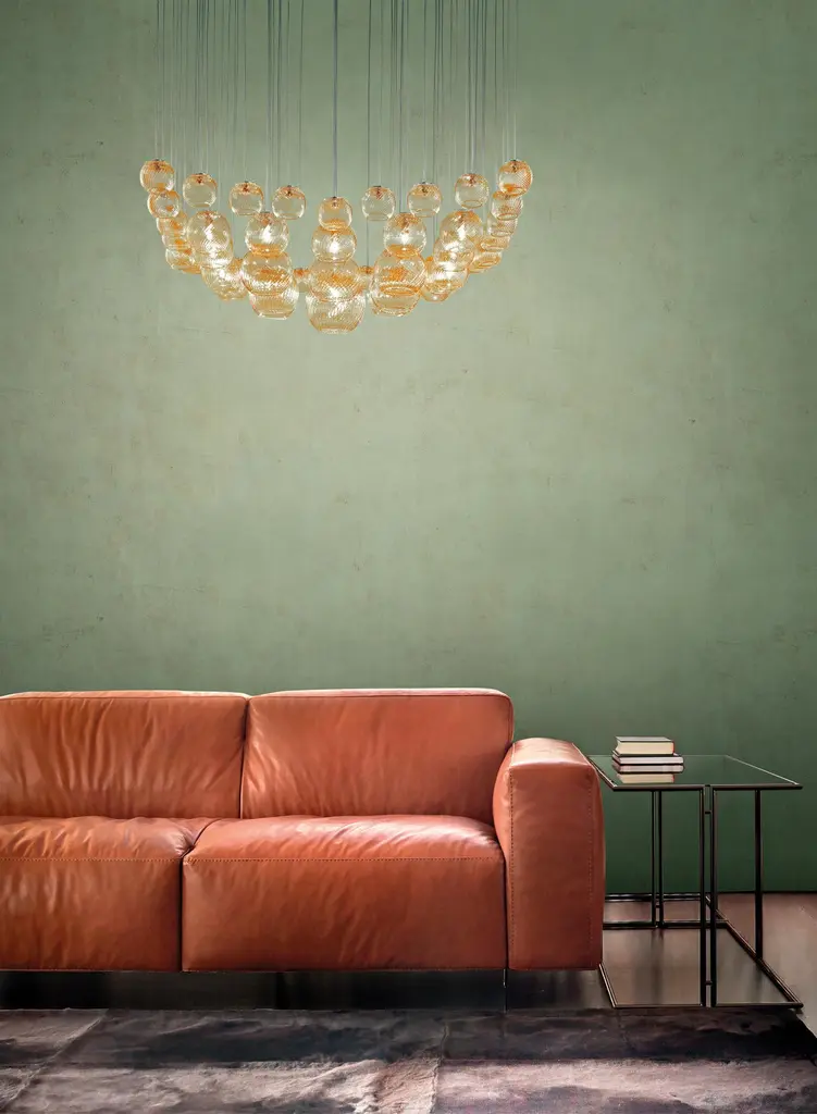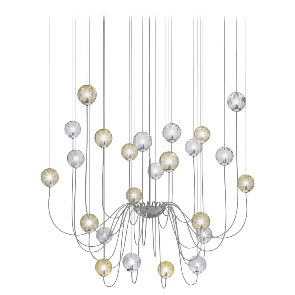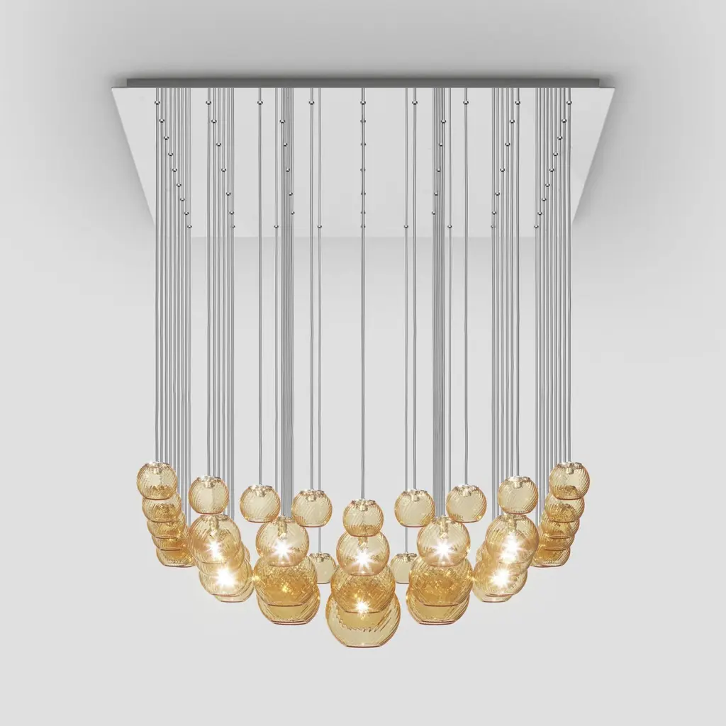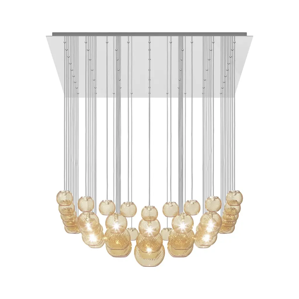 Spherical blown glass elements available in three sizes and four rigadin colours, with and without lighting source. The special design allows the vertical installation of several glass elements and infinite customized combinations.Specifications:Material: GlassLight source: G9 ULNo of bulbs: 17×60W G9 UL (120V/60HZ)Dimmer: DIM 1Year: 2015Glass finish: Amber stripedFrame finish: Mirrored steelDimensions: 108 W x 108 D x 30 H cmCable length: 170 cmAvailable in other glass finish options: White striped, Crystal striped, Smoky stripedAvailable in other frame finish options: Glossy white, Satin nickel Please inquire about customization options.