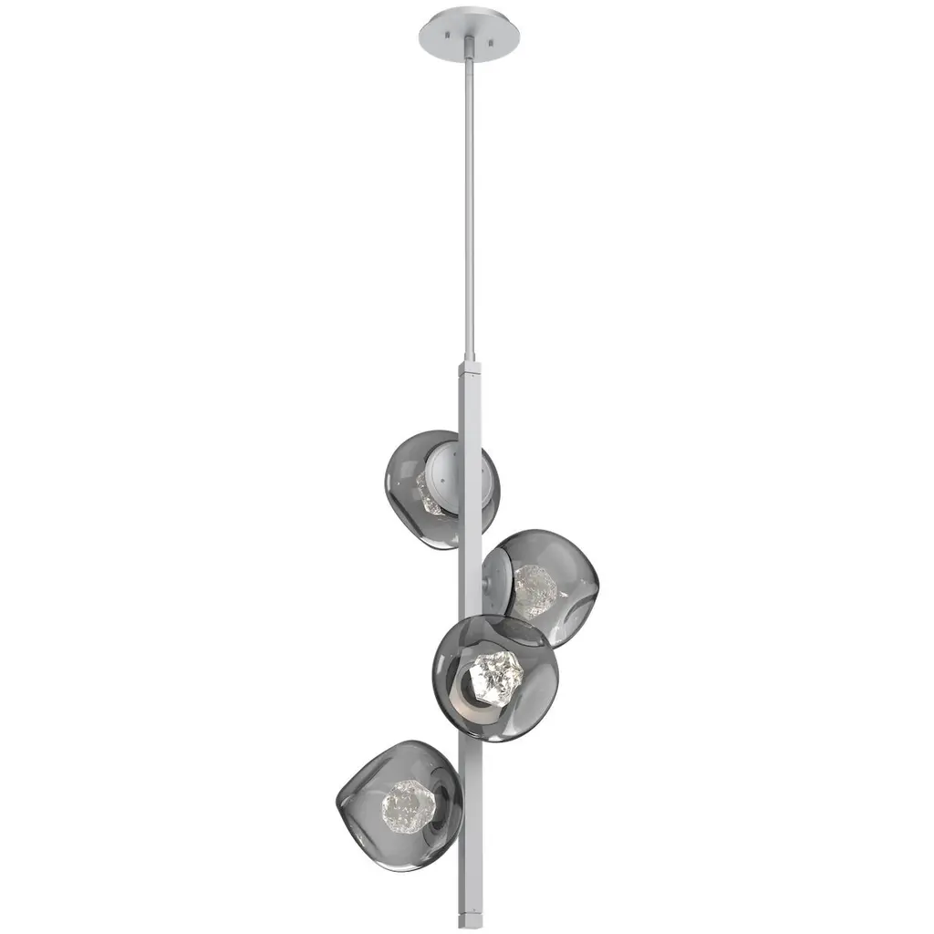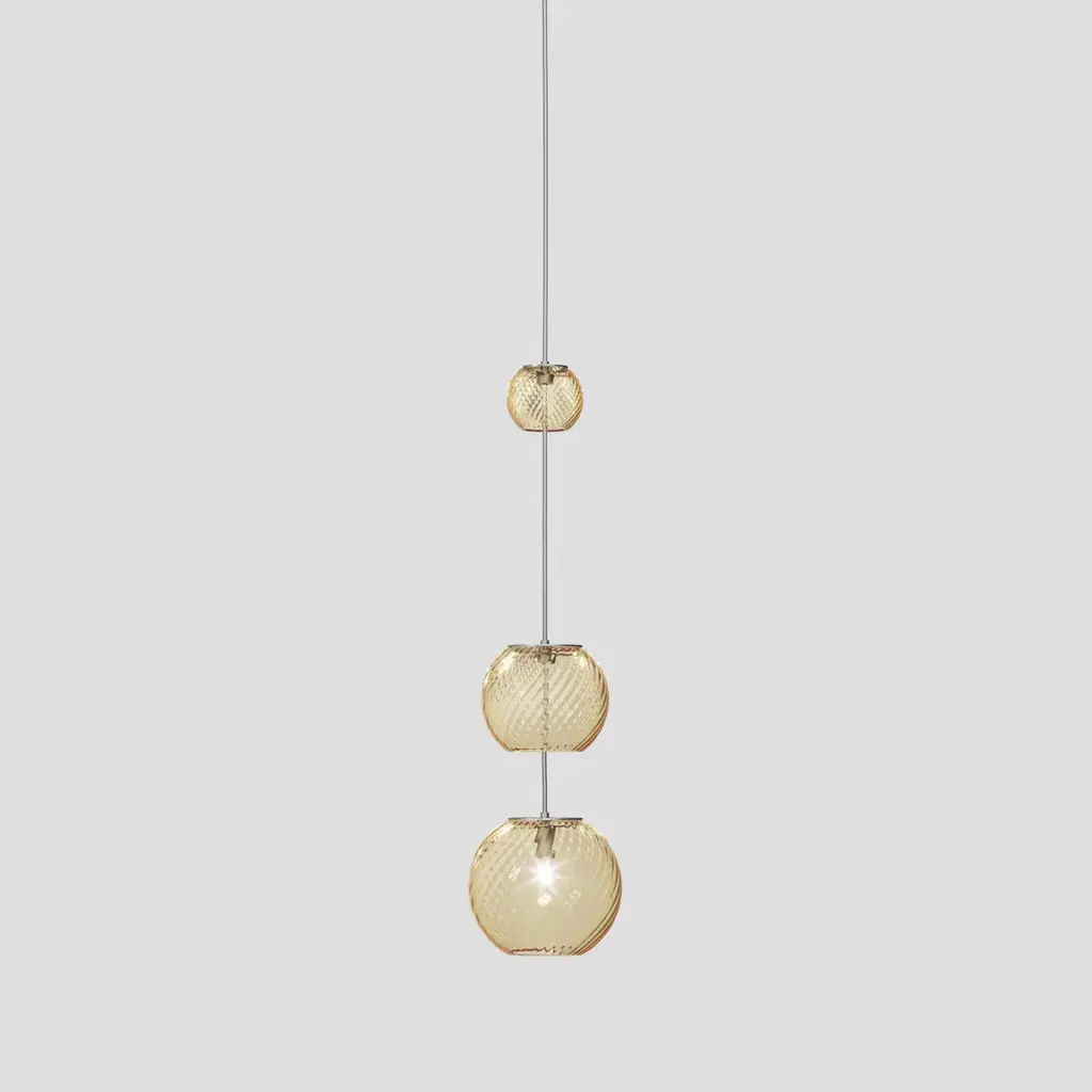 Spherical blown glass elements available in three sizes and four rigadin colours, with and without lighting source. The special design allows the vertical installation of several glass elements and infinite customized combinations.Specifications:Material: GlassLight source: G9 ULNo of bulbs: 1×60W G9 UL (120V/60HZ)Dimmer: DIM 1Year: 2015Glass finish: Amber stripedFrame finish: Satin NickelDimensions: Ø 18 x 50 H cmCable length: 150 cmAvailable in other glass finish options: White Striped, Crystal striped, Smoky stripedPlease inquire about customization options.