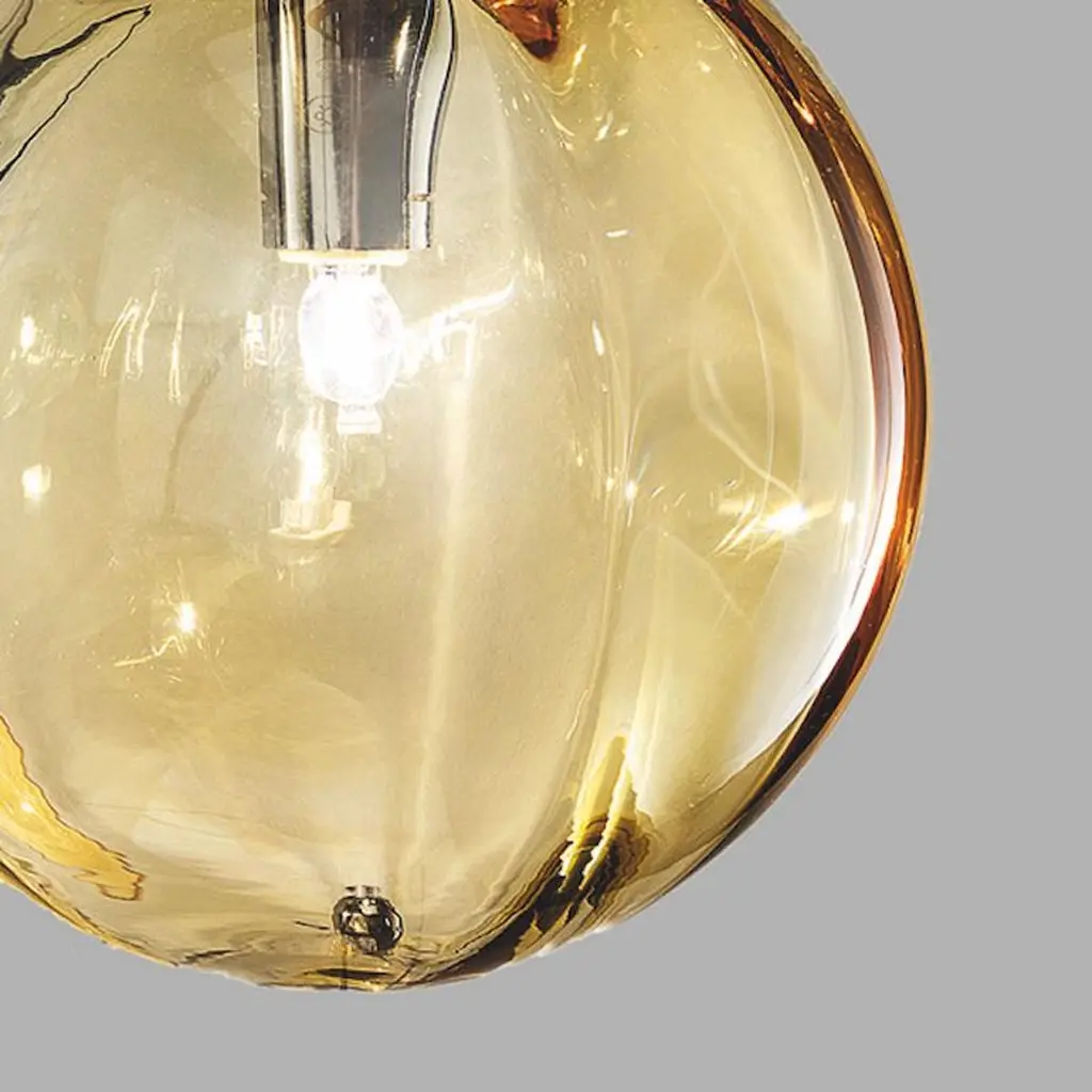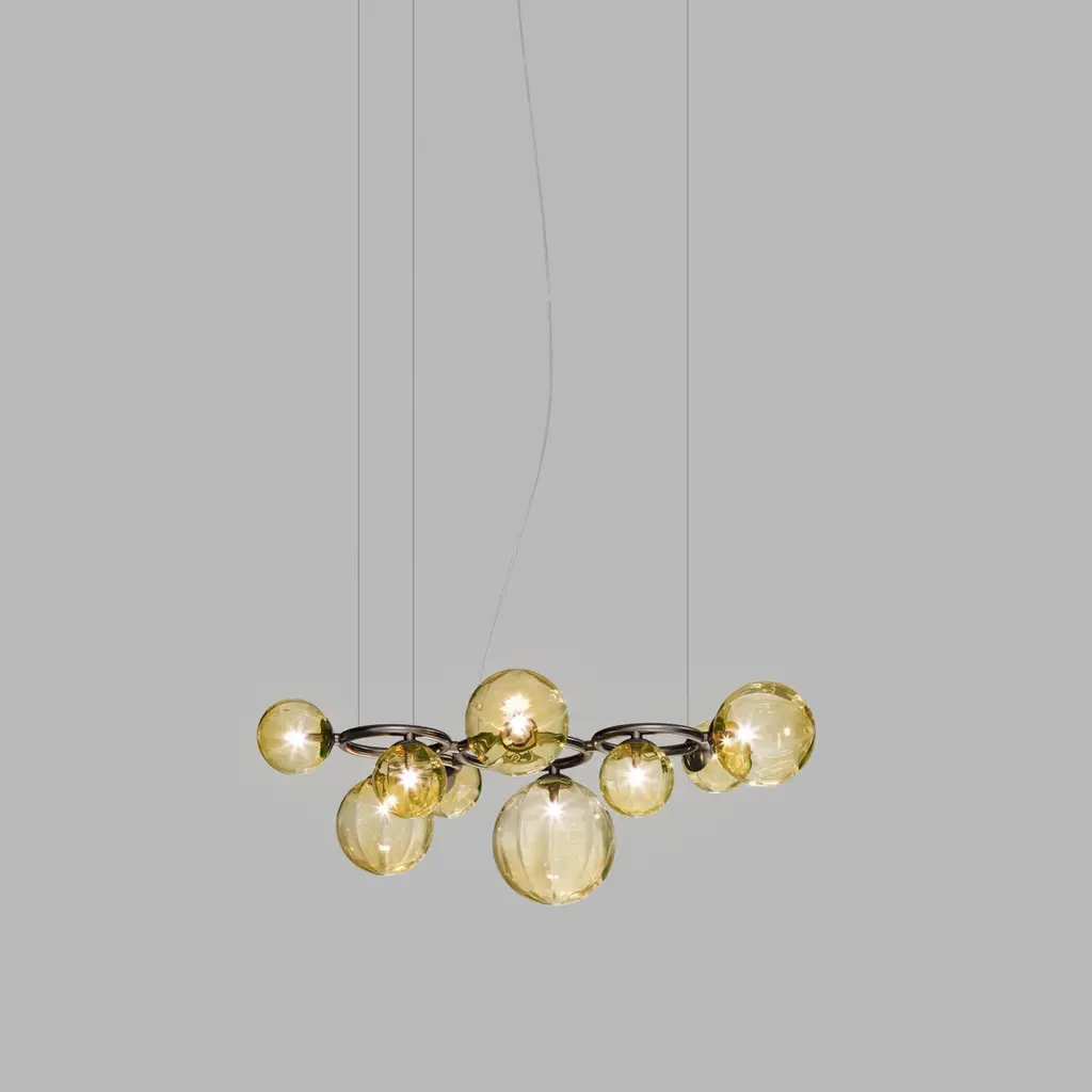 The distinctive feature of this model from the Puppet Ring collection are the rings with increasing diameter. They can be combined in different sequences to form the framework on which the precious glass spheres in three different sizes are placed, blending with the structure thanks to a preformation inside the blown glass. Aesthetically light and elegant, Puppet Ring ethereally combines crystal, smoky, amber and shaded white glass with gold and black matt nickel finishes.Specifications:Material: GlassLight source: G9 ULNo of bulbs: 9x60W G9 UL (120V/60HZ)Dimmer: DIM 1Year: 2019Glass finish: Amber TransparentFrame finish: Matt Black NickelDimensions: 89 W x 113 D x 43 H cmCable length: 200 cmAvailable in other glass finish options: White Shaded, Crystal Transparent, Smoky TransparentAvailable in other frame finish option: Matt gold 3Please inquire about customization options.