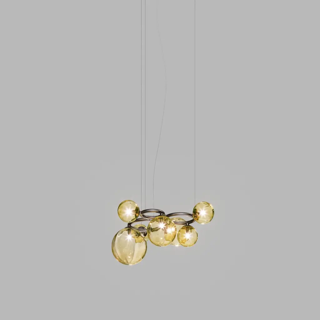 The distinctive feature of this model from the Puppet Ring collection are the rings with increasing diameter. They can be combined in different sequences to form the framework on which the precious glass spheres in three different sizes are placed, blending with the structure thanks to a preformation inside the blown glass. Aesthetically light and elegant, Puppet Ring ethereally combines crystal, smoky, amber and shaded white glass with gold and black matt nickel finishes.Specifications:Material: GlassLight source: G9 ULNo of bulbs: 7x60W G9 UL (120V/60HZ)Dimmer: DIM 1Year: 2019Glass finish: Amber TransparentFrame finish: Matt Black NickelDimensions: 81 W x 86 D x 43 H cmCable length: 200 cmAvailable in other glass finish options: White Shaded, Crystal Transparent, Smoky TransparentAvailable in other frame finish option: Matt gold 3Please inquire about customization options.