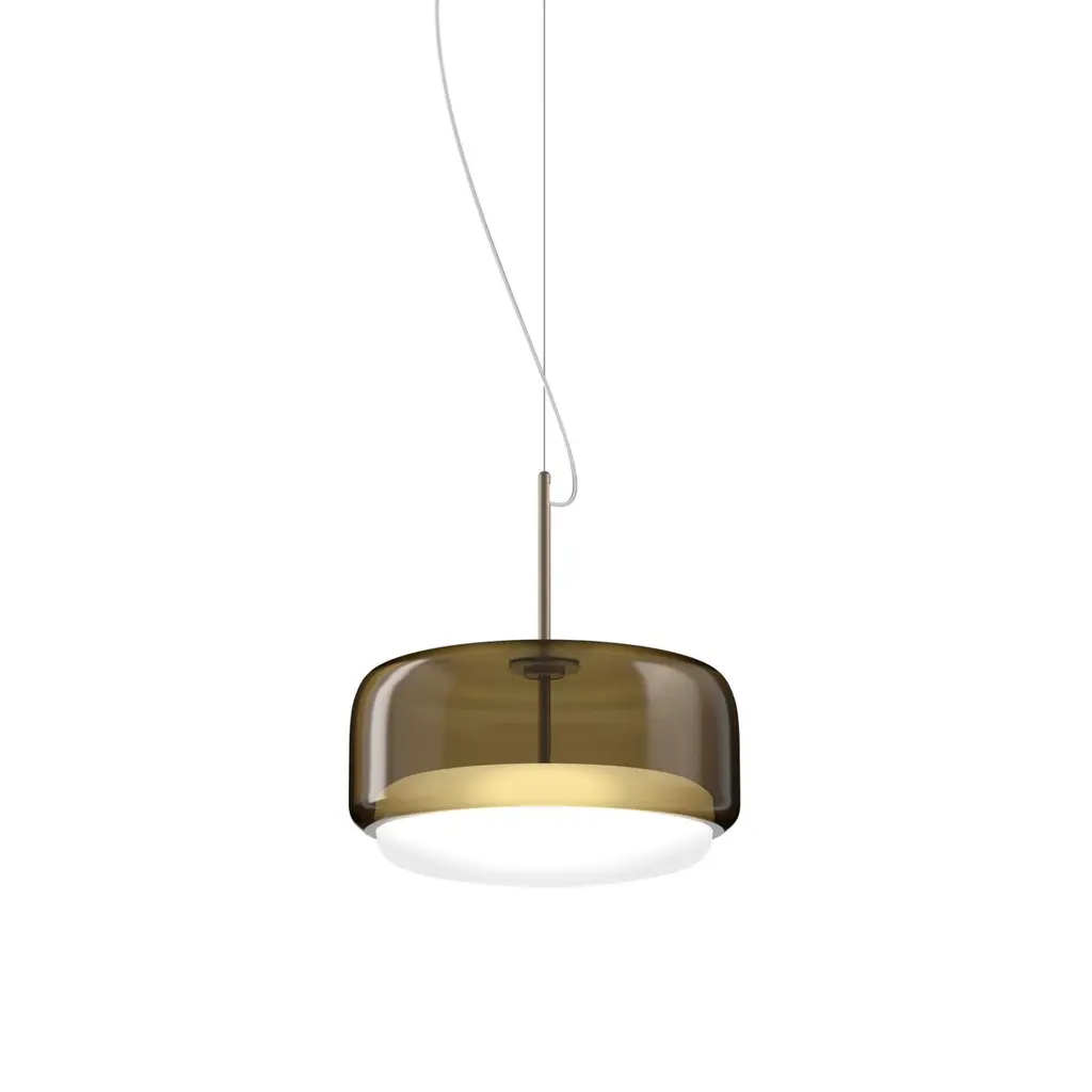 The elegant and delicate look of the blown glass finds a new dimension in Jube. Two glass units placed side by side, so perfectly assembled, that they look like a unique piece. A sinuous lamp, with tone-on-tone colours that give it a precious, vintage mood.Specifications:Material: GlassLight source: LED L2202 ULNo of bulbs: 1x13W L2202 UL (37V)Dimmer: DIM 2Lumen: 2000 lmKelvin: 2700 KYear: 2017Glass finish: Burned Earth WhiteFrame finish: Matt gold 2Dimensions: Ø 38 x 22 H cmCable length: 200 cmAvailable in other glass finish options: White Amethyst, Crystal White, Smoky White, Old Green WhiteAvailable in other frame finish option: Matt steelAvailable in other light source options: LED L2302 UL - $ 1506, LED L3202 UL - $ 1506, LED L3302 UL - $ 1506Available in other kelvin option: 3000 KAvailable in other dimmer option: DIM 3Please inquire about customization options.