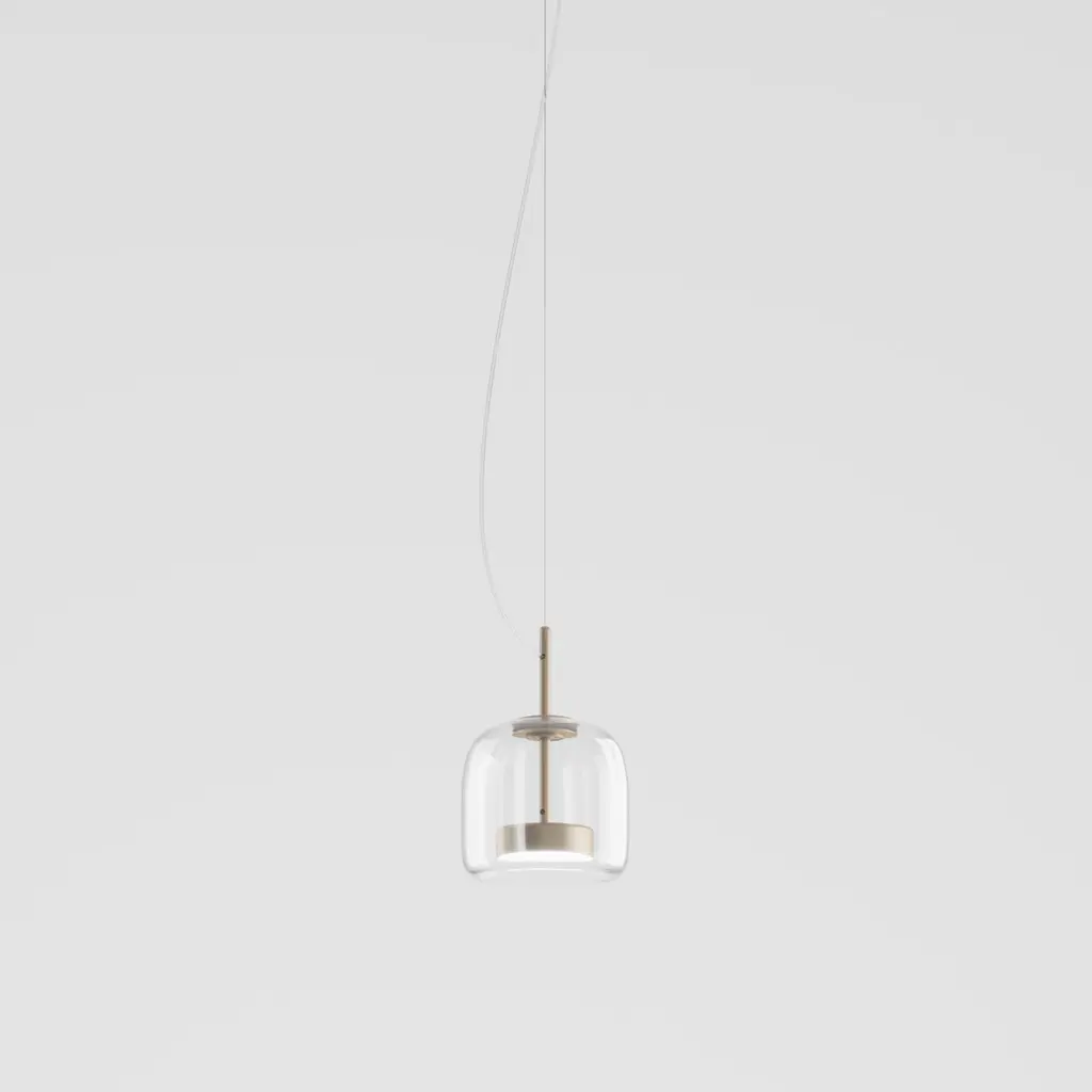 The elegant and delicate look of the blown glass finds a new dimension in Jube. Two glass units placed side by side, so perfectly assembled, that they look like a unique piece. A sinuous lamp, with tone-on-tone colours that give it a precious, vintage mood.Specifications:Material: GlassLight source: LED L2214 ULNo of bulbs: 1×8.5W L2214 UL (24V)Dimmer: DIM 2Lumen: 1200 lmKelvin: 2700 KYear: 2017Glass finish: Crystal TransparentFrame finish: Matt gold 2Dimensions: Ø 18 x 17 H cmCable length: 200 cmAvailable in other glass finish options: Light Amethyst Transparent, Smoky Transparent, Burned Earth Transparent, Old Green TransparentAvailable in other frame finish option: Matt steelAvailable in other light source options: LED L2314 UL - $ 862, LED L3214 UL - $ 862, LED L3314 UL - $ 862Available in other kelvin option: 3000 KAvailable in other dimmer option: DIM 3Please inquire about customization options.
