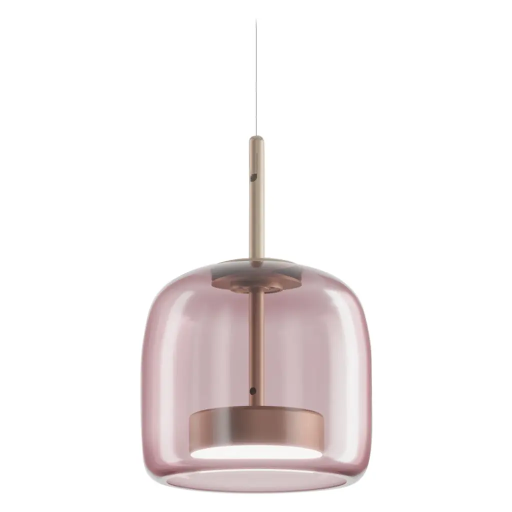The elegant and delicate look of the blown glass finds a new dimension in Jube. Two glass units placed side by side, so perfectly assembled, that they look like a unique piece. A sinuous lamp, with tone-on-tone colours that give it a precious, vintage mood.Specifications:Material: GlassLight source: LED L2302 ULNo of bulbs: 1x13W L2302 UL (37V)Dimmer: DIM 3Lumen: 2000 lmKelvin: 2700 KYear: 2017Glass finish: Light Amethyst TransparentFrame finish: Matt steelDimensions: Ø 26 x 24 H cmCable length: 200 cmAvailable in other glass finish options: Crystal Transparent, Smoky Transparent, Burned Earth Transparent, Old Green TransparentAvailable in other frame finish option: Matt gold 2Available in other light source options: LED L2202 UL - $ 1062, LED L3202 UL - $ 1062, LED L3302 UL - $ 1062Available in other kelvin option: 3000 KAvailable in other dimmer option: DIM 2Please inquire about customization options.