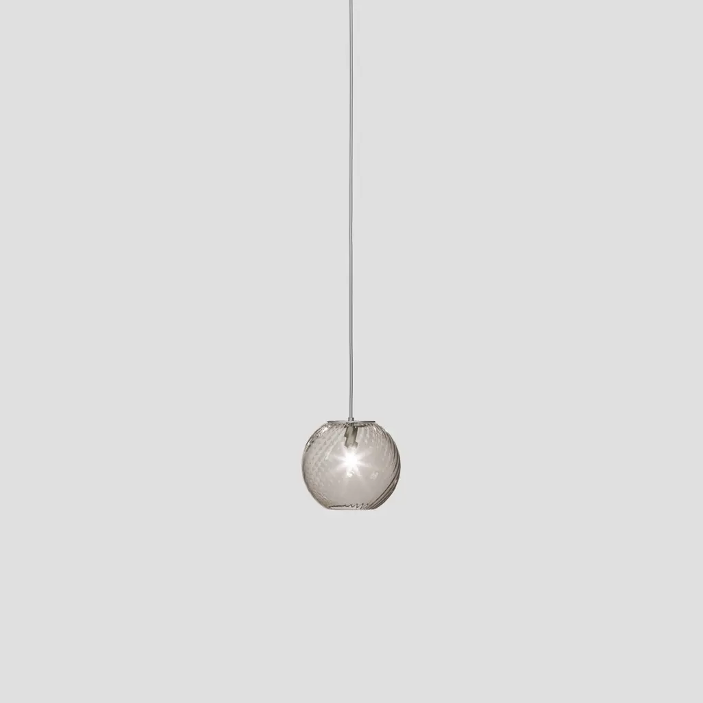 Spherical blown glass elements available in three sizes and four rigadin colours, with and without lighting source. The special design allows the vertical installation of several glass elements and infinite customized combinations.Specifications:Material: GlassLight source: G9 ULNo of bulbs: 1×60W G9 UL (120V/60HZ)Dimmer: DIM 1Year: 2015Glass finish: Smoky StripedFrame finish: Satin nickelDimensions: Ø 18 x 16 H cmCable length: 200 cmAvailable in other glass finish options: White striped, Crystal striped, Amber stripedPlease inquire about customization options.