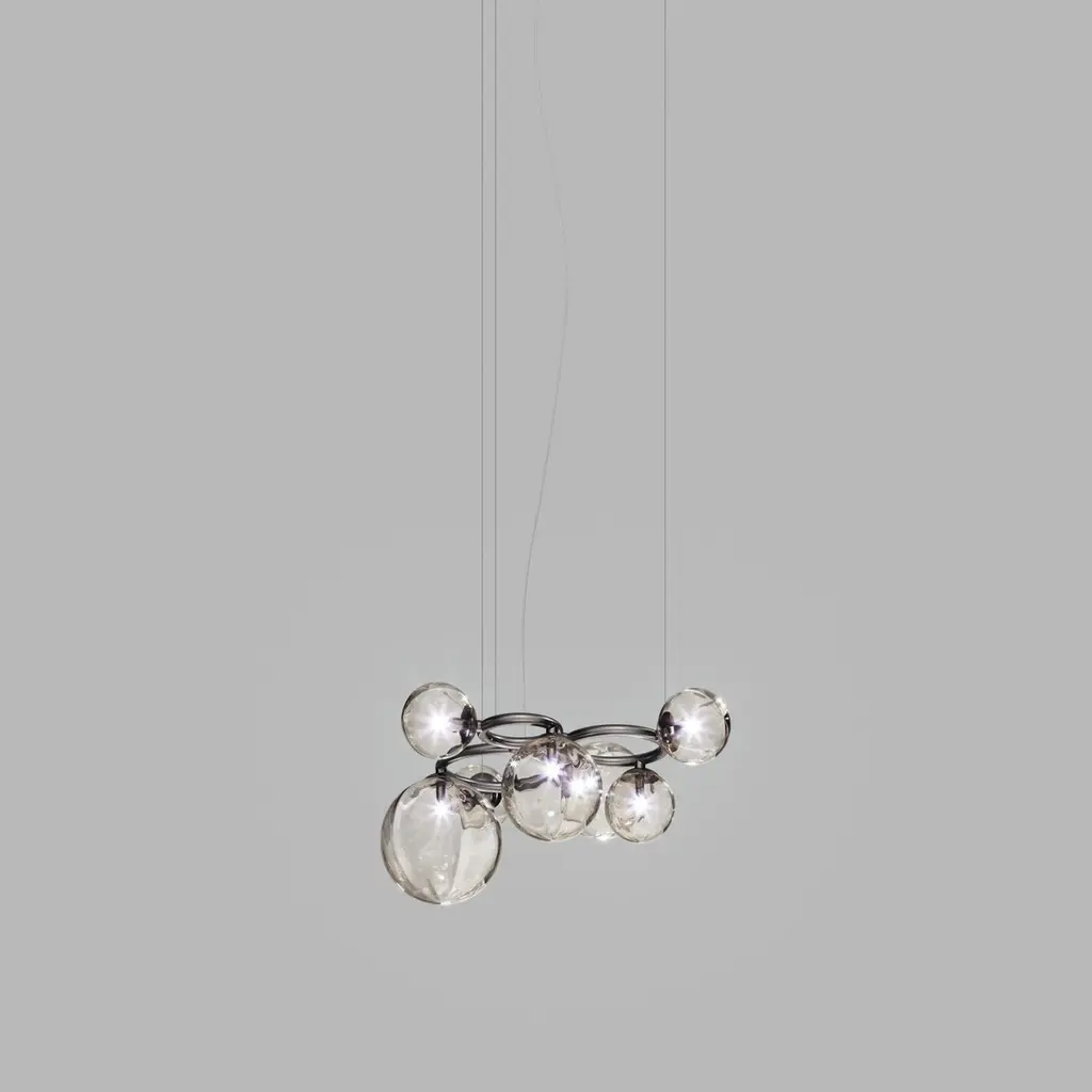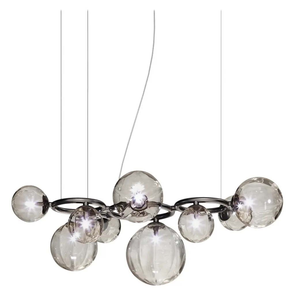 The distinctive feature of this model from the Puppet Ring collection are the rings with increasing diameter. They can be combined in different sequences to form the framework on which the precious glass spheres in three different sizes are placed, blending with the structure thanks to a preformation inside the blown glass. Aesthetically light and elegant, Puppet Ring ethereally combines crystal, smoky, amber and shaded white glass with gold and black matt nickel finishes.Specifications:Material: GlassLight source: G9 ULNo of bulbs: 7x60W G9 UL (120V/60HZ)Dimmer: DIM 1Year: 2019Glass finish: Smoky TransparentFrame finish: Matt Black NickelDimensions: 81 W x 86 D x 43 H cmCable length: 200 cmAvailable in other glass finish options: Amber Transparent, White Shaded, Crystal TransparentAvailable in other frame finish option: Matt gold 3Please inquire about customization options.