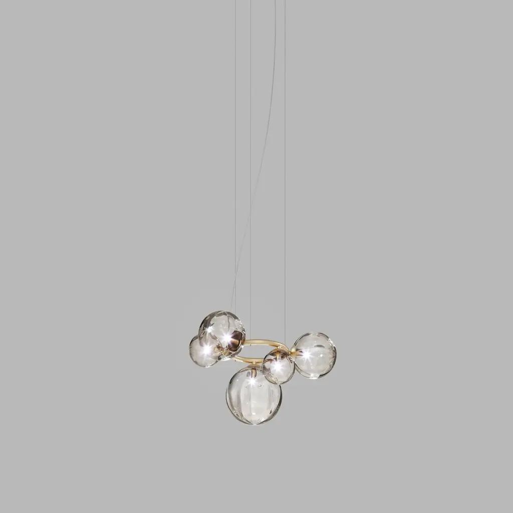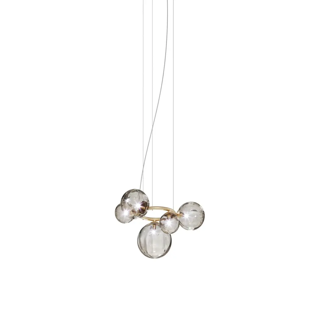 The distinctive feature of this model from the Puppet Ring collection are the rings with increasing diameter. They can be combined in different sequences to form the framework on which the precious glass spheres in three different sizes are placed, blending with the structure thanks to a preformation inside the blown glass. Aesthetically light and elegant, Puppet Ring ethereally combines crystal, smoky, amber and shaded white glass with gold and black matt nickel finishes.Specifications:Material: GlassLight source: G9 ULNo of bulbs: 5x60W G9 UL (120V/60HZ)Dimmer: DIM 1Year: 2019Glass finish: Smoky TransparentFrame finish: Matt Gold 3Dimensions: 72 W x 57 D x 43 H cmCable length: 200 cmAvailable in other glass finish options: Amber Transparent, White Shaded, Crystal TransparentAvailable in other frame finish option: Matt black nickelPlease inquire about customization options.