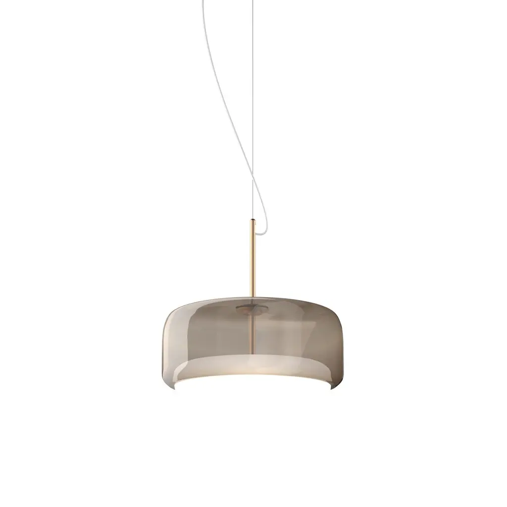 The elegant and delicate look of the blown glass finds a new dimension in Jube. Two glass units placed side by side, so perfectly assembled, that they look like a unique piece. A sinuous lamp, with tone-on-tone colours that give it a precious, vintage mood.Specifications:Material: GlassLight source: LED L2202 ULNo of bulbs: 1x13W L2202 UL (37V)Dimmer: DIM 2Lumen: 2000 lmKelvin: 2700 KYear: 2017Glass finish: Smoky WhiteFrame finish: Matt gold 2Dimensions: Ø 38 x 22 H cmCable length: 200 cmAvailable in other glass finish options: White Amethyst, Crystal White, Burned Earth White, Old Green WhiteAvailable in other frame finish option: Matt steelAvailable in other light source options: LED L2302 UL - $ 1506, LED L3202 UL - $ 1506, LED L3302 UL - $ 1506Available in other kelvin option: 3000 KAvailable in other dimmer option: DIM 3Please inquire about customization options.